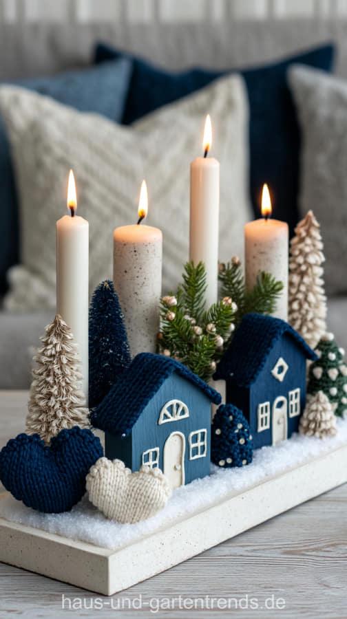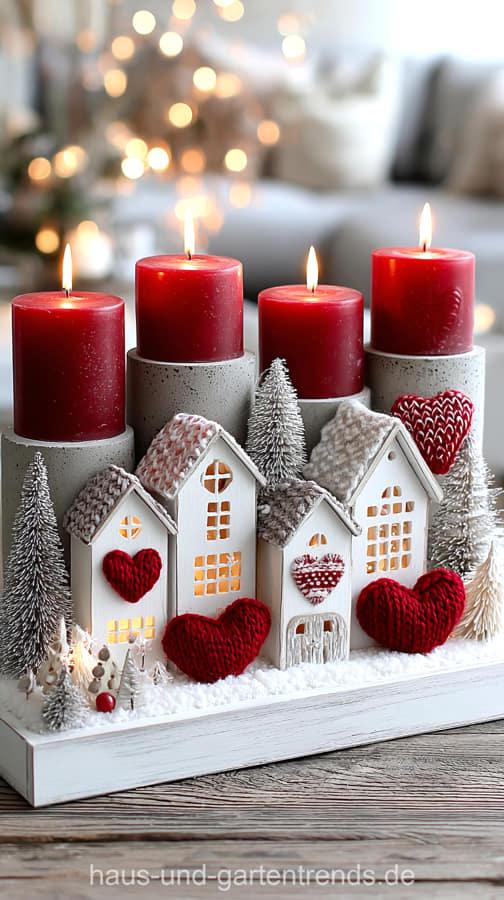 Schwedische Adventskranz-Ideen mit Deko-Häuschen