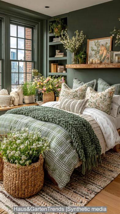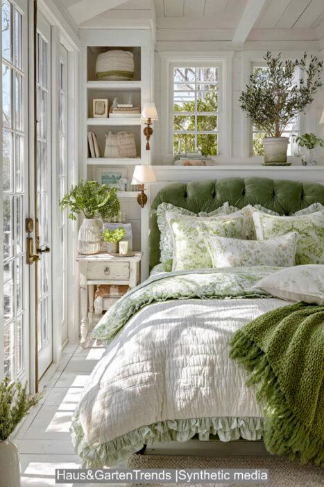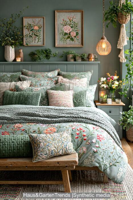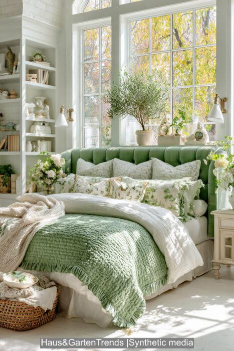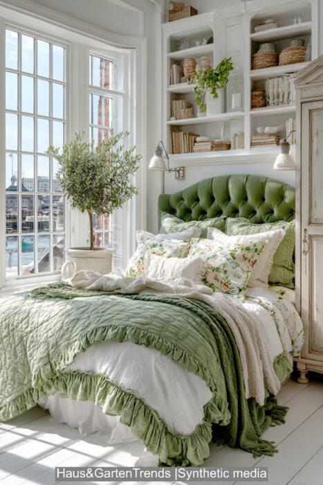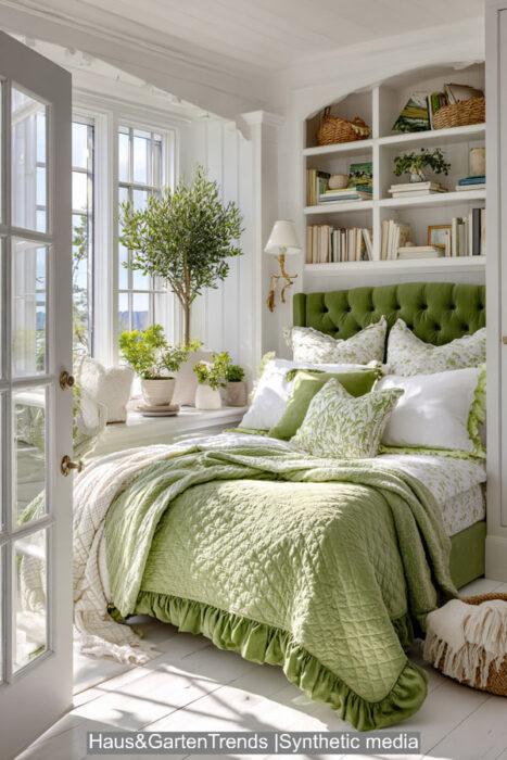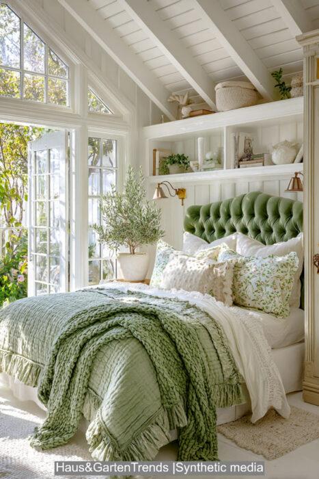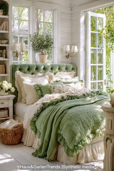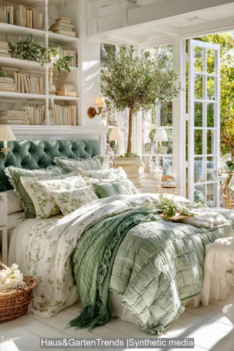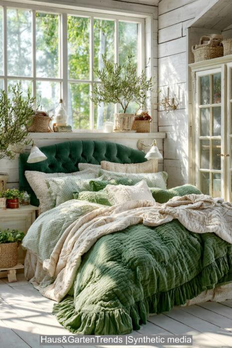 In der Mitte des Raumes steht ein Bett, das wie ein Nest inmitten dieses Waldes wirkt. Die Bettwäsche, eine Symphonie in Grün, kann von Jade bis Oliv, von Minze bis hin zu smaragdfarbenen Akzenten variieren. Überwurfkissen in vielfältigen Mustern und Texturen – manche mit ethnischen Drucken, andere mit feinen Stickereien – laden zum Eintauchen und Verweilen ein.