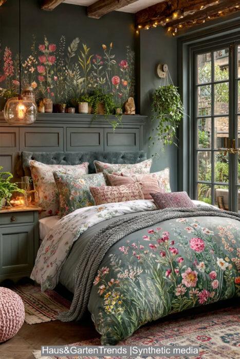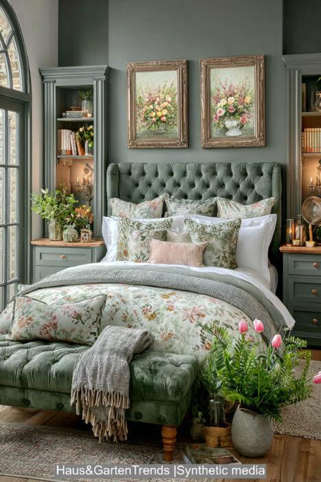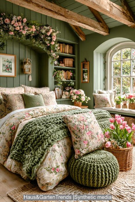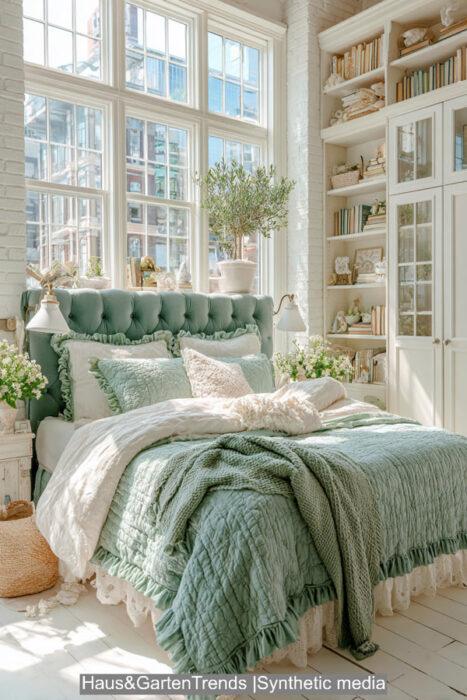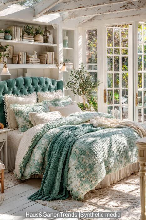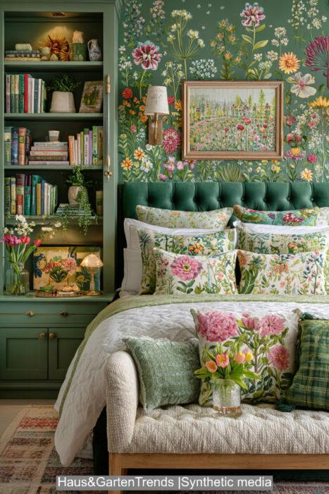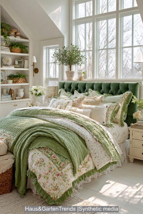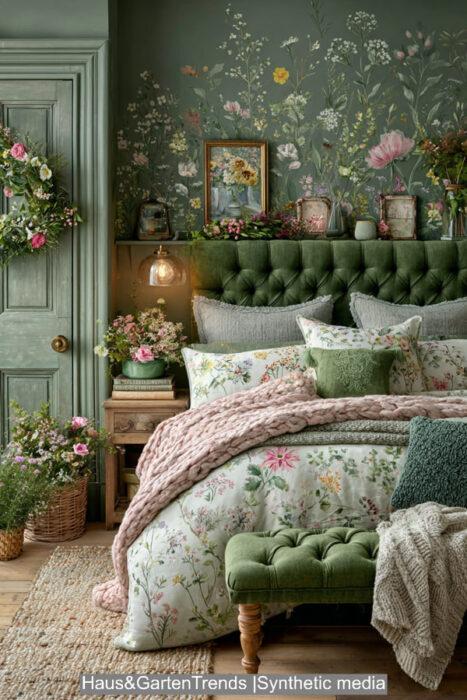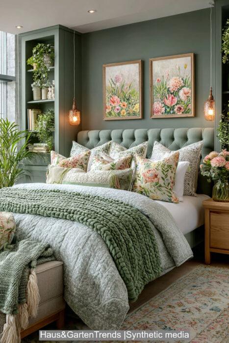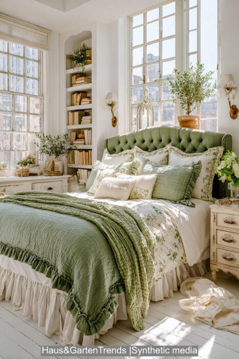 In der Mitte des Raumes steht ein Bett, das wie ein Nest inmitten dieses Waldes wirkt. Die Bettwäsche, eine Symphonie in Grün, kann von Jade bis Oliv, von Minze bis hin zu smaragdfarbenen Akzenten variieren. Überwurfkissen in vielfältigen Mustern und Texturen – manche mit ethnischen Drucken, andere mit feinen Stickereien – laden zum Eintauchen und Verweilen ein.