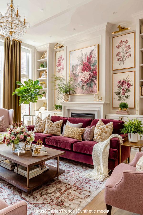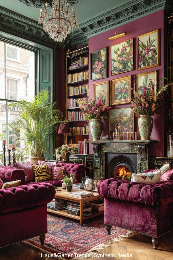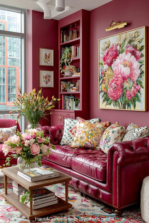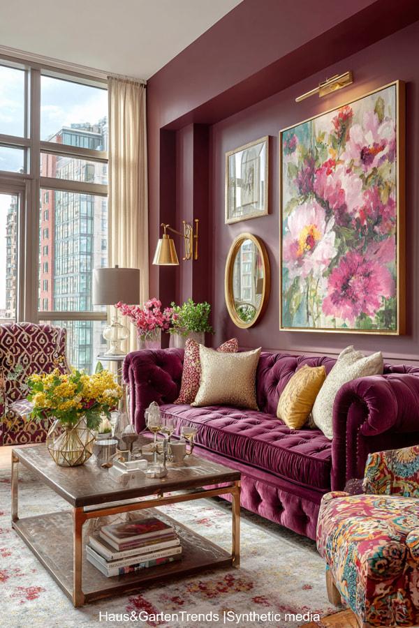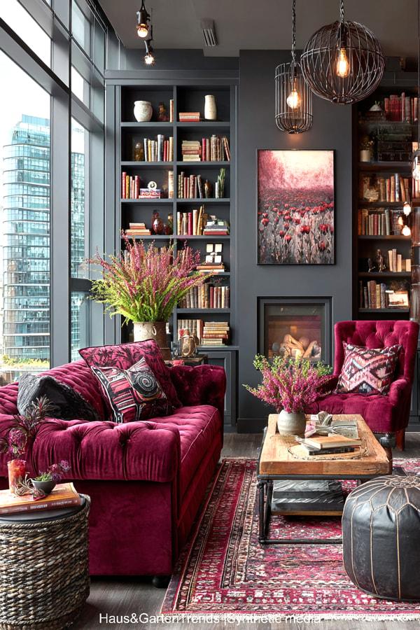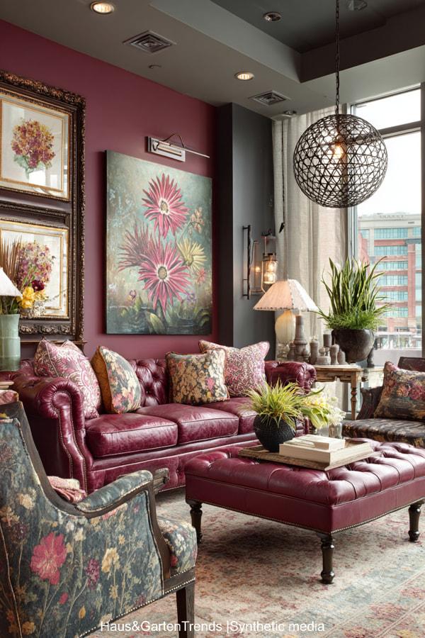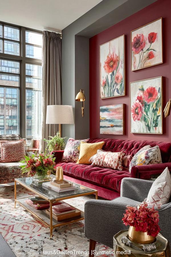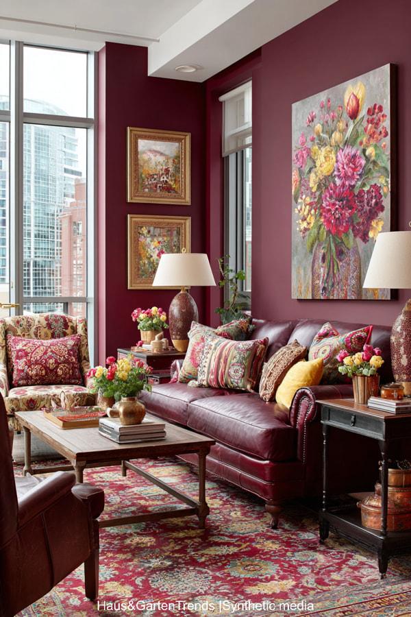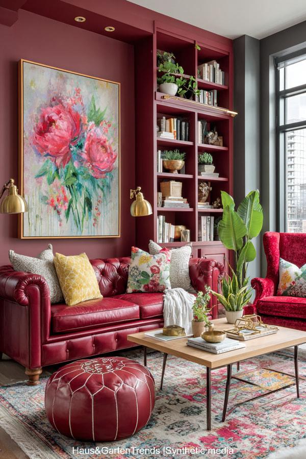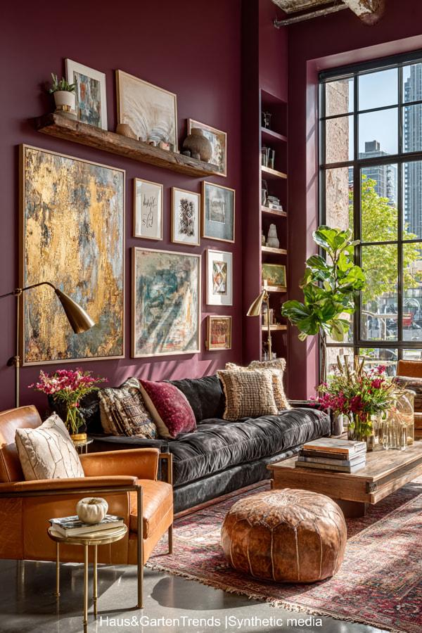 8. Düsterer Burgund-Maximalismus – Das Wohnzimmer als Kunstgalerie