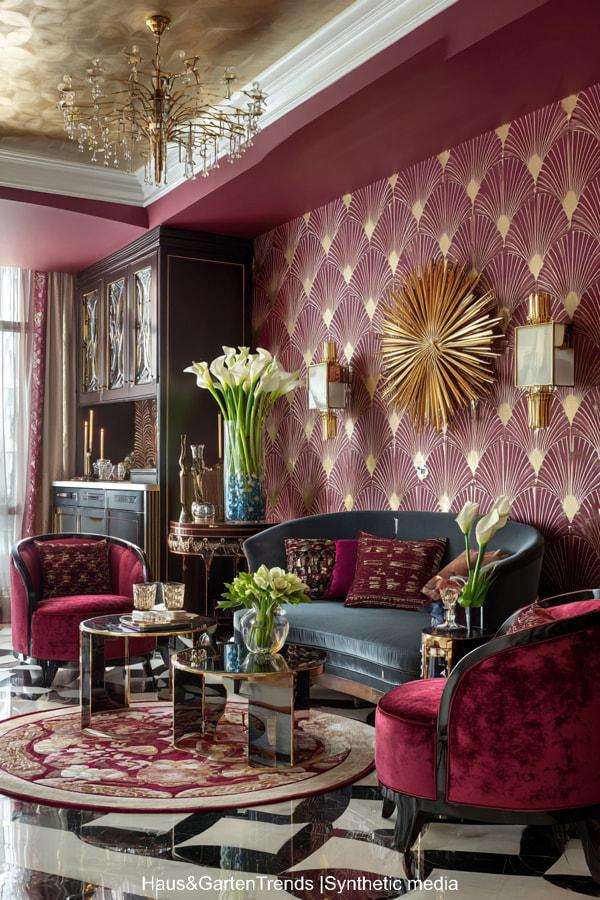 Art déco und Burgund sind eine Kombination, die für sich spricht. Geometrische Tapetenmuster in Gold auf Burgund-Grund, ein Sonnenspiegel aus geschlagenem Gold und ein geschwungenes Mitternachtsblau-Samtsofa schaffen ein Ambiente, das wie aus einem Pariser Hotel der Zwischenkriegszeit entsprungen scheint. Der Boden aus schwarz-weißem Marmor im Schachbrettmuster gibt dem Raum eine dramatische Grundierung. Lackiertes schwarzes Mobiliar mit verspiegelten Einlagen und Seidendamastvorhänge in Elfenbein und Burgund komplettieren den Look.