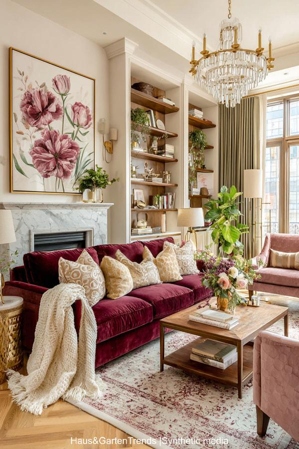 Ein tiefes Burgund-Samtsofa ist das ultimative Statement-Möbelstück für ein elegantes Wohnzimmer. Kombiniert mit antikgoldfarbenen Kissen, einem handgeknüpften Perserteppich und einem Marmorkamin entsteht ein Interieur, das an die großen Salons des 19. Jahrhunderts erinnert. Flankierende Sessel in staubigem Rosé greifen die Farbpalette auf, ohne sie zu überwältigen. Entscheidend ist die Beleuchtung: Ein Kristallkronleuchter über dem Sofa und zwei hohe Messingstandleuchten schaffen ein warmes, schmeichelhaftes Licht, das die samtigen Oberflächen zum Leben erweckt.