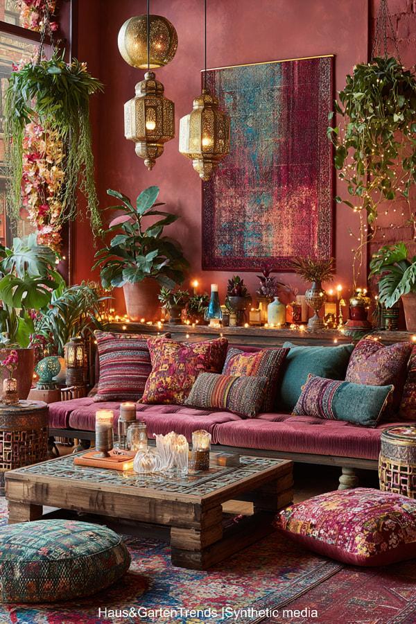 Für Mutige und Sammler: Das eklektisch-böhmische Wohnzimmer lebt von der Fülle. Ein großformatiger Wandteppich in Burgund, Rost und Smaragdgrün wird zur Hauptwand. Darauf reagieren niedriges Sofa, Bodenkissen und ein Gewirr aus marokkanischen Hängelaternen aus Messing. Überlappende Vintageteppiche in Dunkelrot und Indigoblau bedecken den Boden. Rankpflanzen, Makramees, Kristallobjekte und gestapelte Kunstbücher auf einem Rattancouchtisch – dieser Raum erzählt Geschichten und verlangt nach immer neuer Entdeckung.