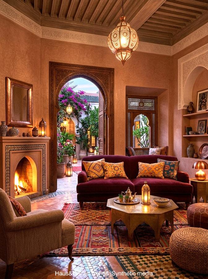 Dieser Einrichtungsstil entführt direkt in die Paläste Marokkos und Andalusiens. Die Wände sind in tiefem Burgund mit handaufgetragenen Goldmuster-Schablonen verziert – ein subtiles Arabesken-Motiv, das im Kerzenlicht lebt und schimmert. Niedrige Diwan-Sofas in reichen Stoffen aus Burgundrot, Smaragdgrün und Safrangelb sind mit einer Fülle von bestickten Seidenkissen belegt und rahmen einen zentralen Bereich ein, auf dem ein großer marokkanischer Teppich in Tiefrot und Elfenbein liegt. Hängende Messinglampen mit farbigem Glasbesatz tauchen den Raum in ein warmes, gefärbtes Licht in Bernstein und Rubintönen. Ein Mashrabiyya-Regalwerk aus gedrechseltem Holz teilt den Raum und wirft filigrane Schatten. Schwere Seidenbrokatstoffe in Burgund und Gold hängen als Raumteiler vom Boden bis zur Decke. Ein Raum, der alle Sinne gleichzeitig anspricht.