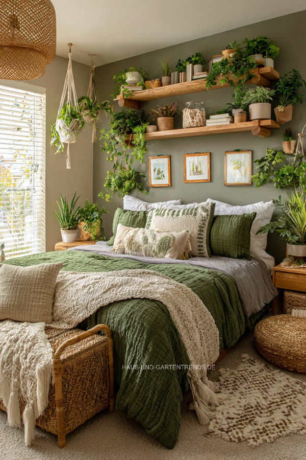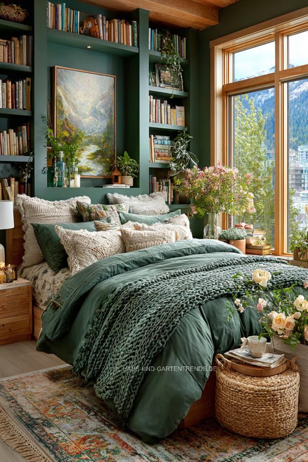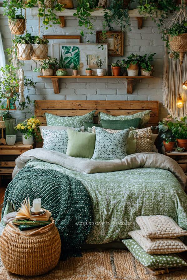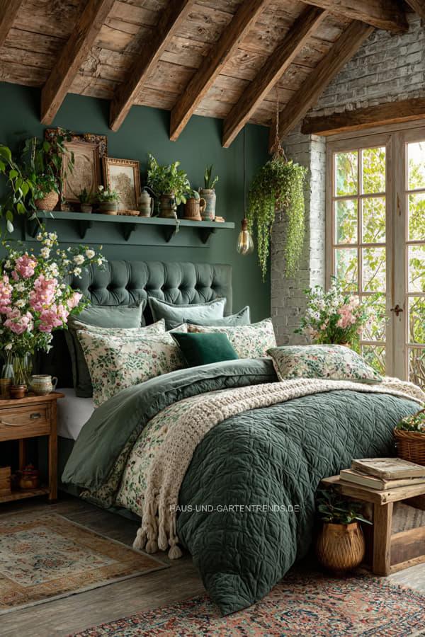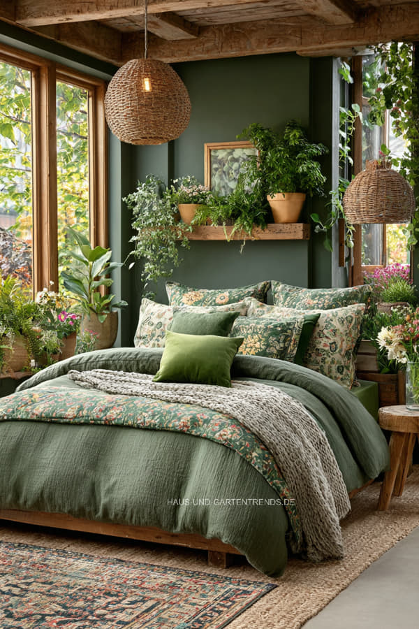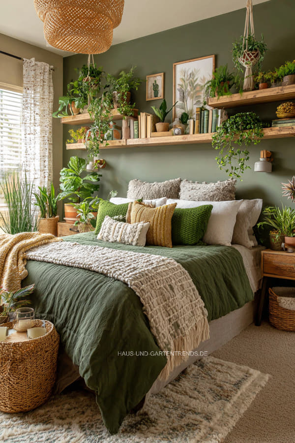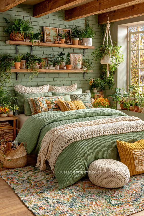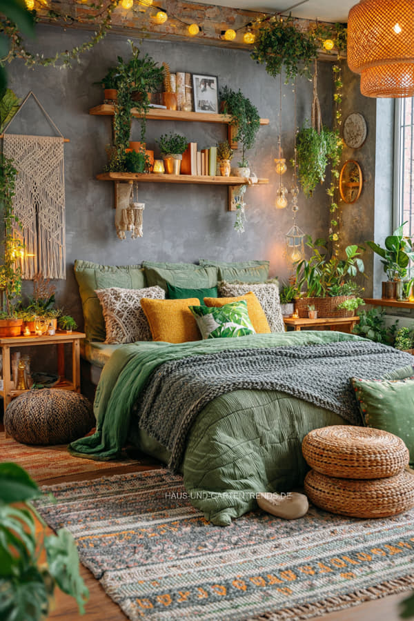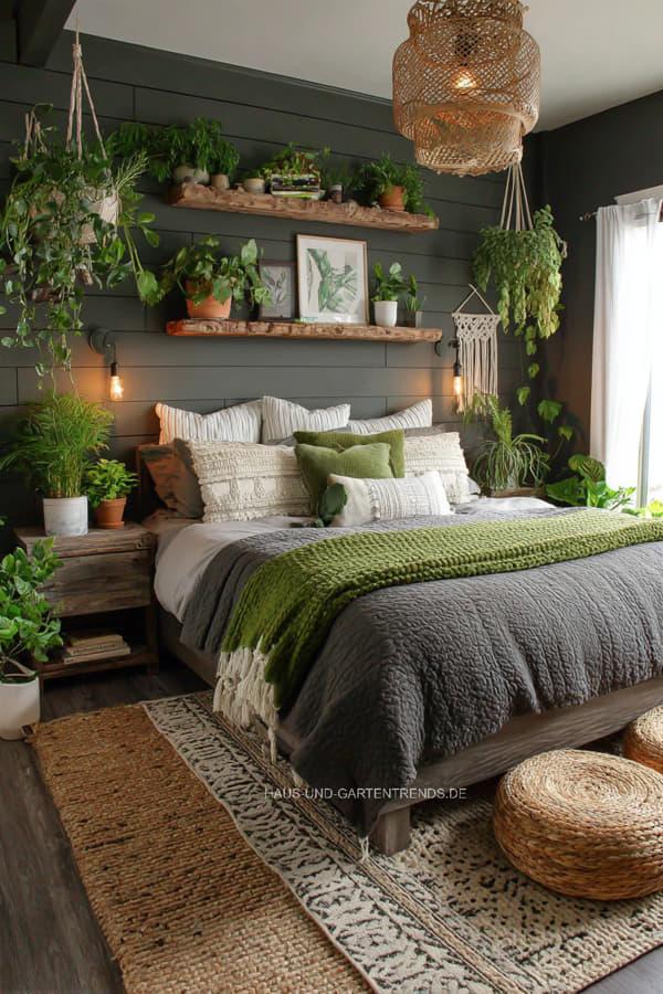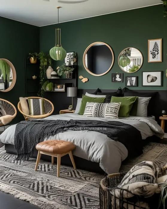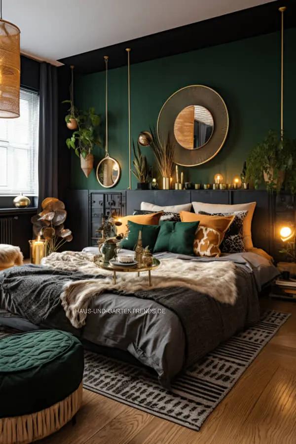 Tauchen Sie mit uns in die mystische Wald-Atmosphäre dieser Boho-Chic Schlafzimmer in Dunkelgrün ein: Von tiefgrünen Akzentwänden, die an das den Farbton der Tannen erinnern, bis hin zu sanft fließenden Stoffen und kunstvollen Dekorationen und Wandbehänge, die den freigeistigen Boho-Chic verkörpern. Entdecken Sie, wie Sie mit grünen Bettdecken, traumhaften Hängepflanzen, runden Spiegeln mit Goldakzenten und rustikalen Holzelementen eine Atmosphäre schaffen, die sowohl erdend als auch edel wirkt.