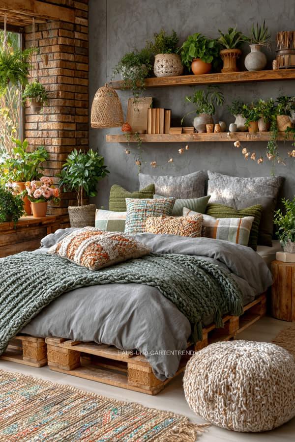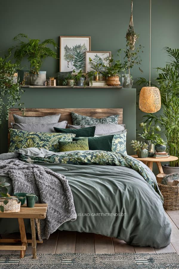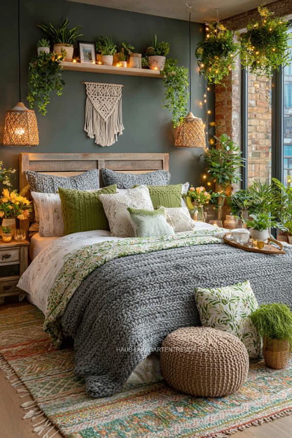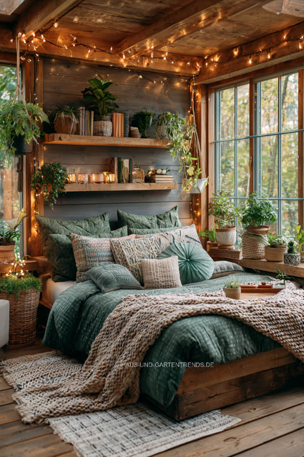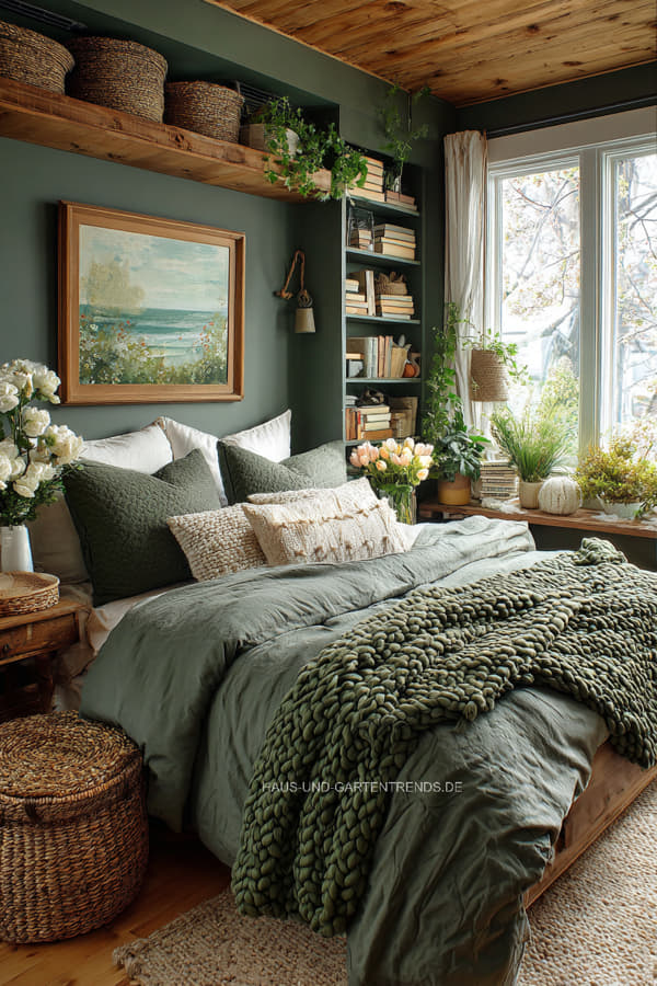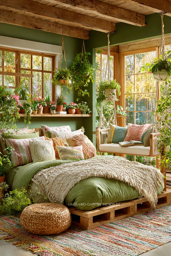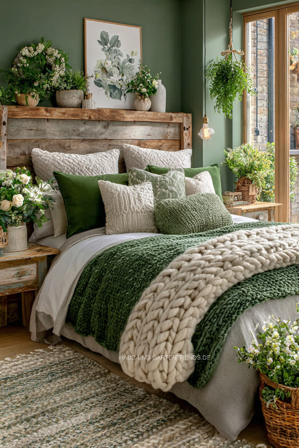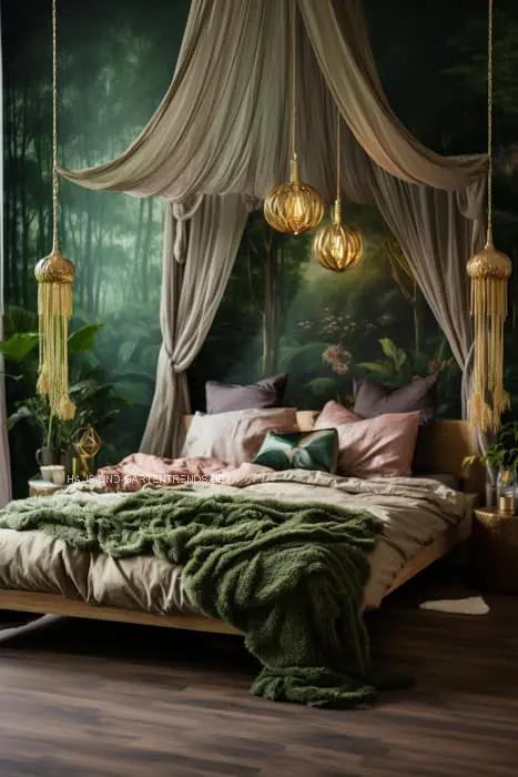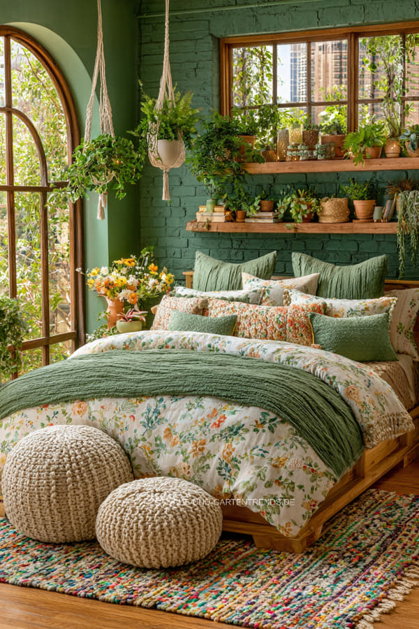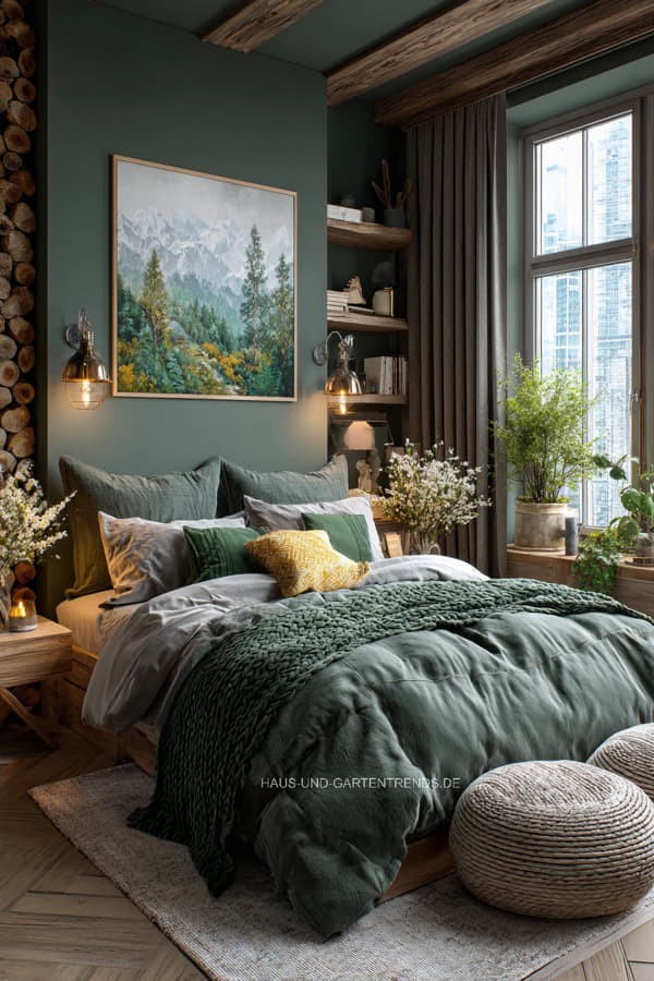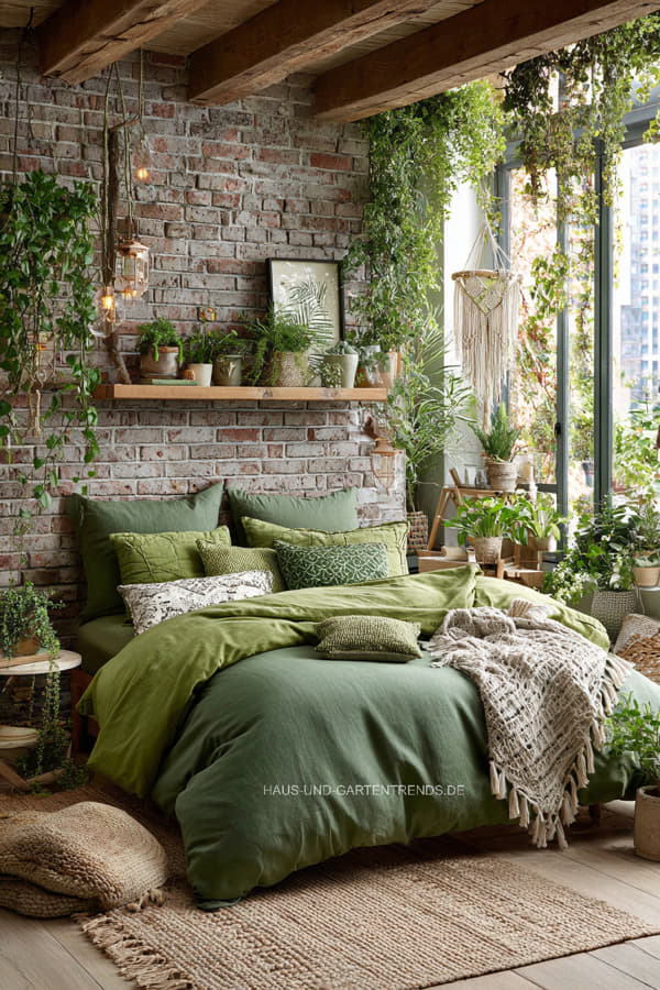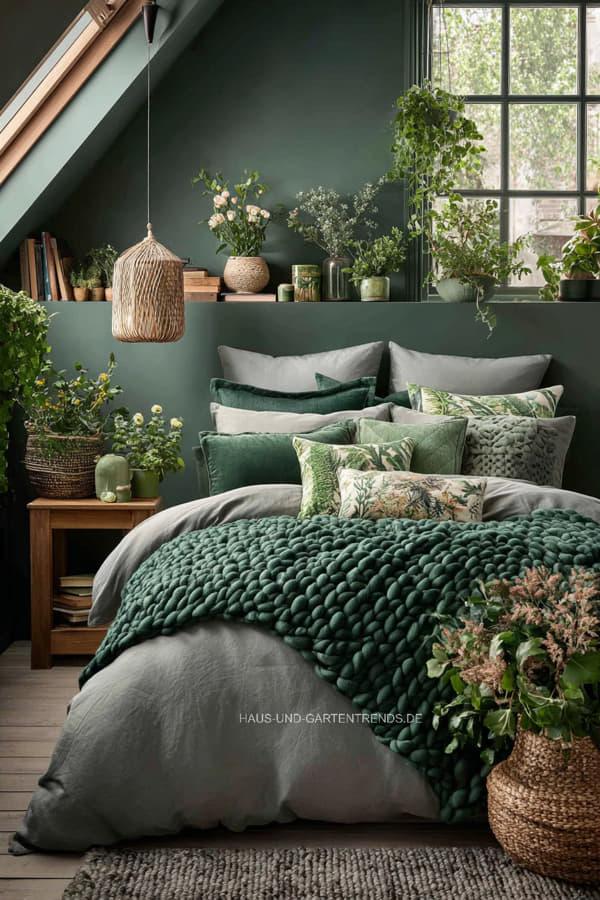 Tauchen Sie mit uns in die mystische Wald-Atmosphäre dieser Boho-Chic Schlafzimmer in Dunkelgrün ein: Von tiefgrünen Akzentwänden, die an das den Farbton der Tannen erinnern, bis hin zu sanft fließenden Stoffen und kunstvollen Dekorationen und Wandbehänge, die den freigeistigen Boho-Chic verkörpern. Entdecken Sie, wie Sie mit grünen Bettdecken, traumhaften Hängepflanzen, runden Spiegeln mit Goldakzenten und rustikalen Holzelementen eine Atmosphäre schaffen, die sowohl erdend als auch edel wirkt.