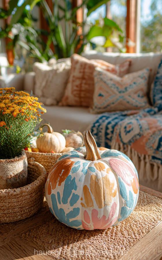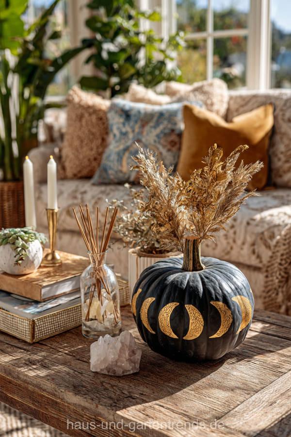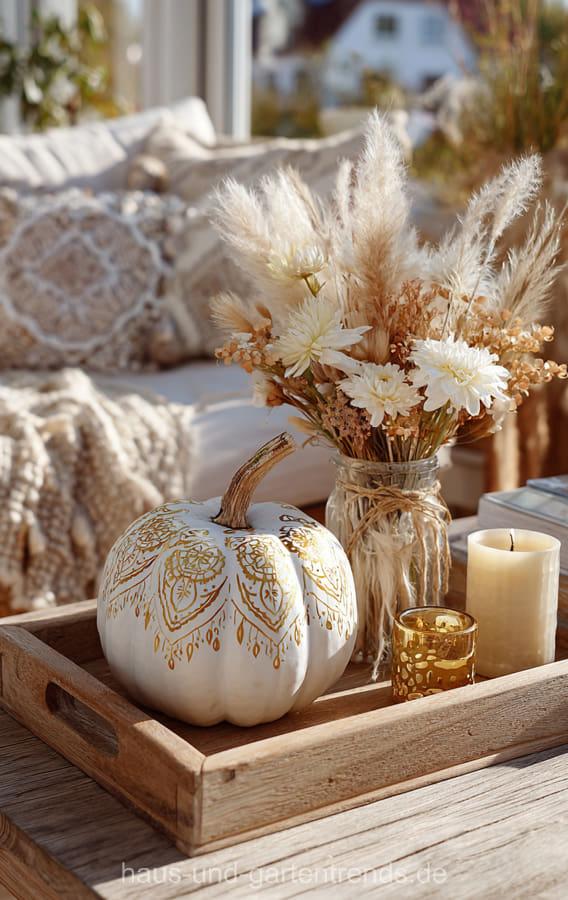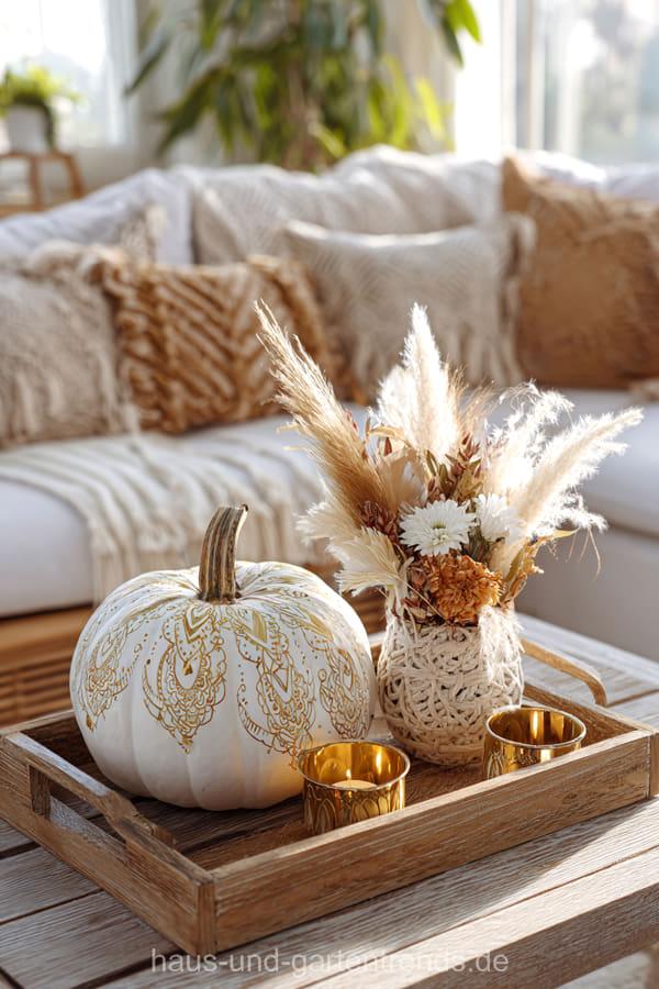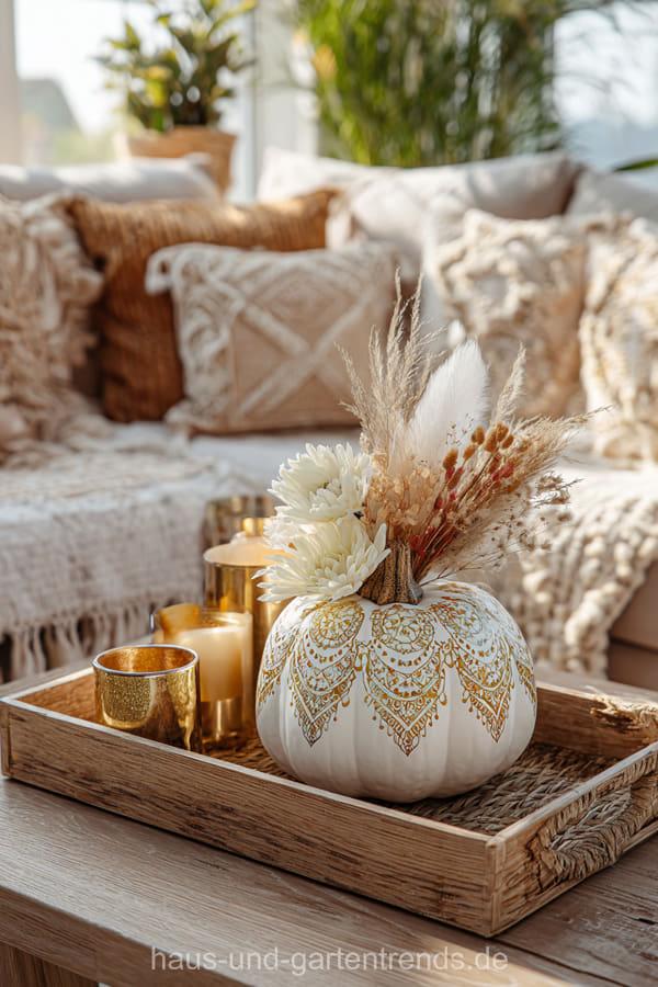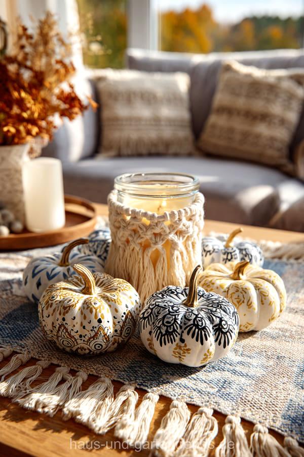 Boho, oder Bohemian Style, kombiniert Elemente aus verschiedenen Kulturen und künstlerischen Ausdrucksformen. Verwenden Sie Pastellfarben und malen Sie Mandalas, Federn oder ethnische Muster auf den Kürbis. Kombinieren Sie verschiedene Designs für einen eklektischen Look.