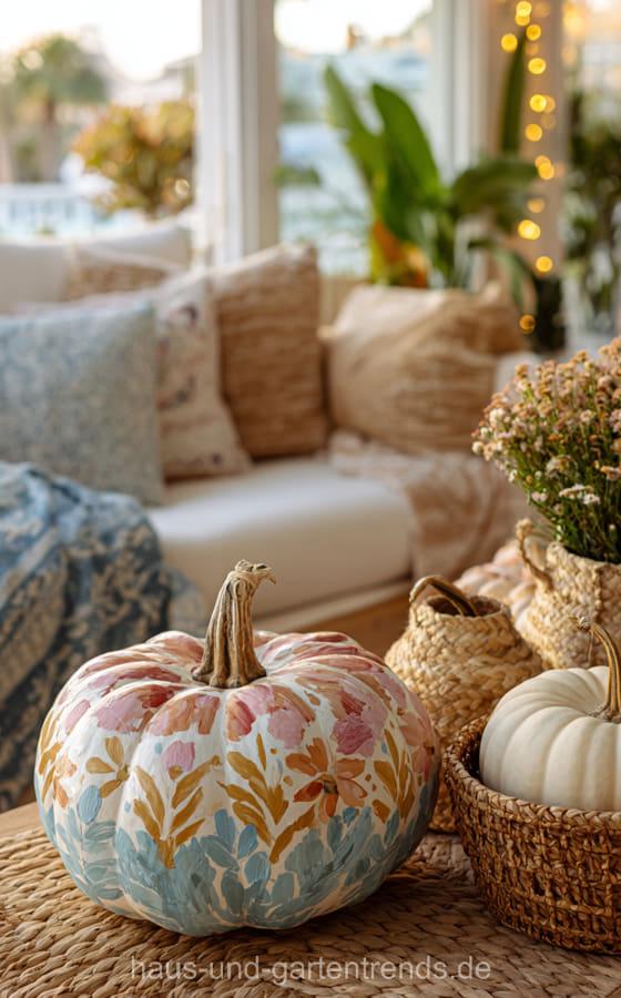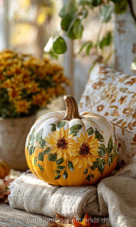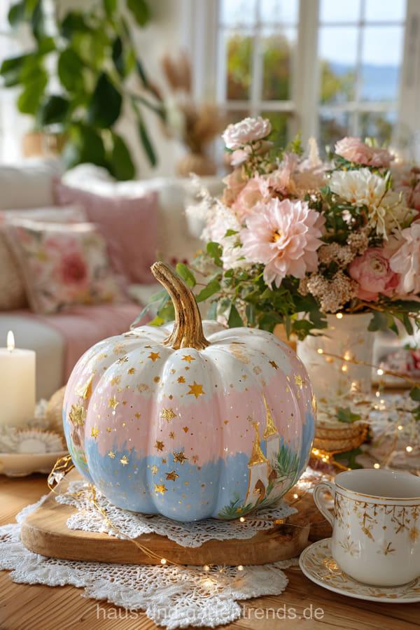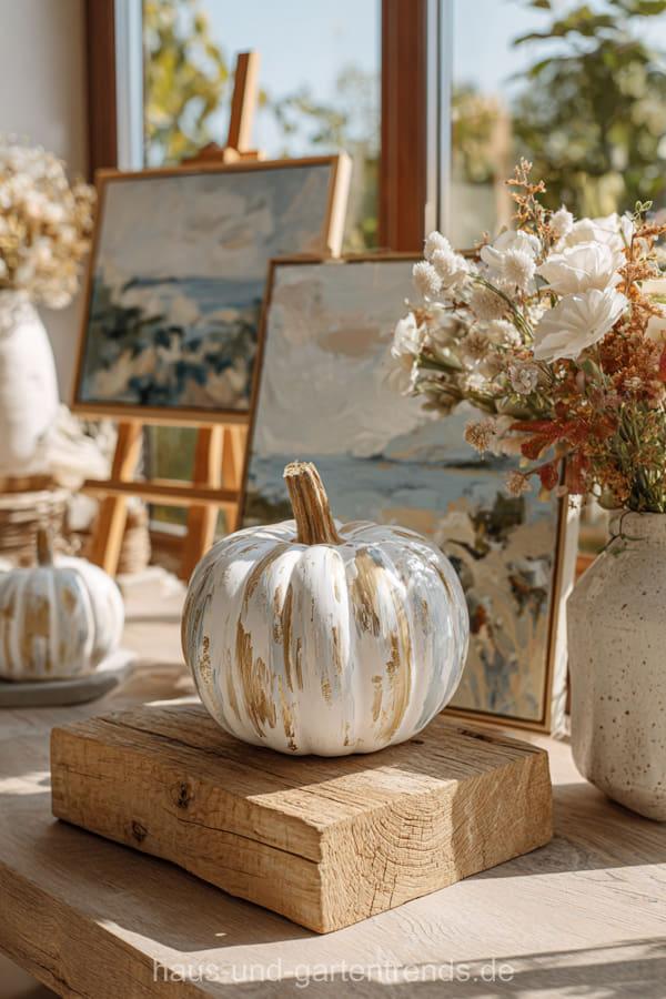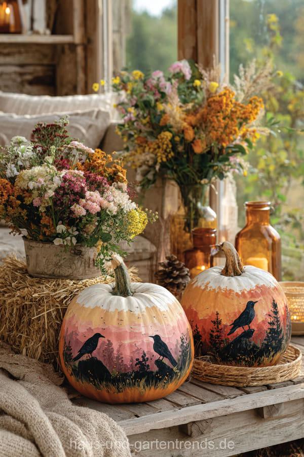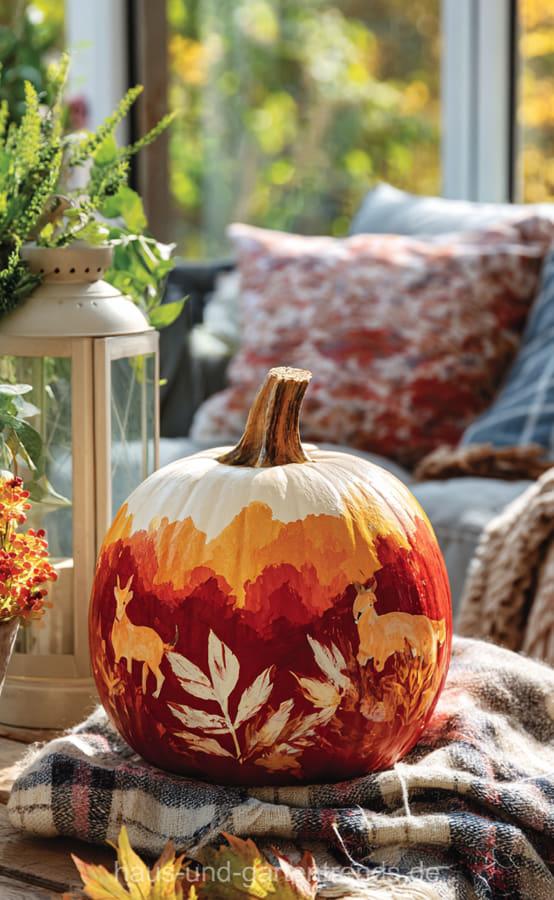 Ein Kürbis kann mehr sein als nur ein dekoratives Element; er kann zur Leinwand für ein kleines Kunstwerk werden. Beginnen Sie, indem Sie den Kürbis mit einer Basisfarbe, wie Weiß oder Beige, grundieren. Sobald diese getrocknet ist, können Sie ein Landschaftsbild darauf malen. Denken Sie an einen Sonnenuntergang, einen Wald, ein Gebirge oder jede andere Szenerie, die Ihnen gefällt. Nutzen Sie feine Pinsel, um Details hinzuzufügen und das Bild zum Leben zu erwecken.