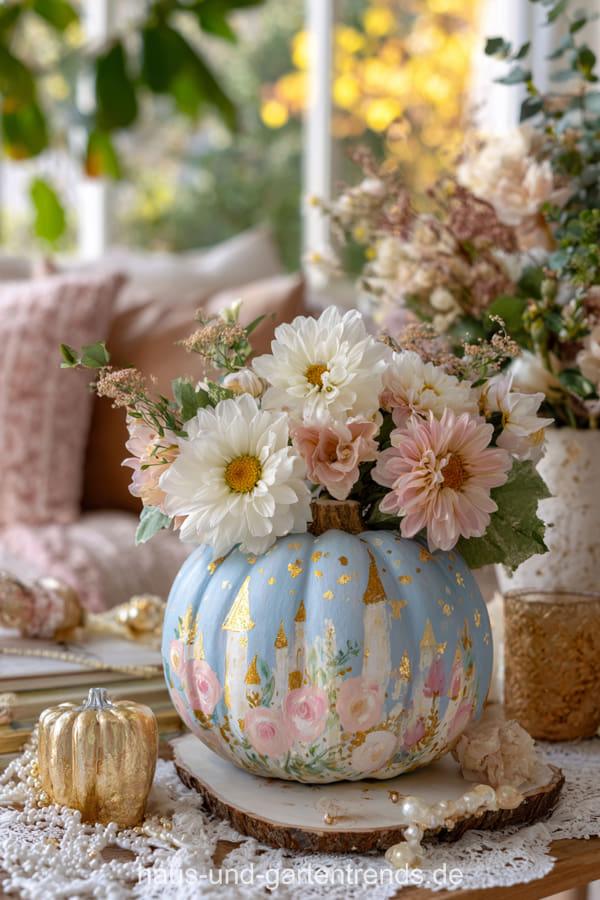 Für diesen kreativen Ansatz benötigen Sie einen großen Kürbis. Schneiden Sie die Oberseite ab und höhlen Sie den Kürbis aus. Platzieren Sie ein Gefäß mit Wasser im Inneren und füllen Sie es mit Herbstblumen für ein festliches Arrangement.