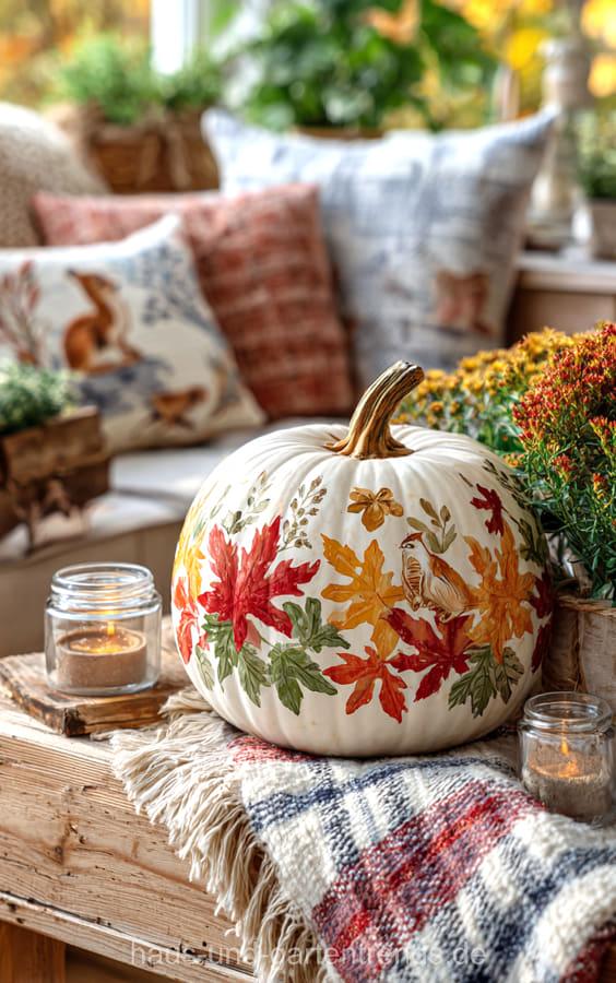 12. Kürbis mit Herbstblätter-Motiv basteln und bemalen