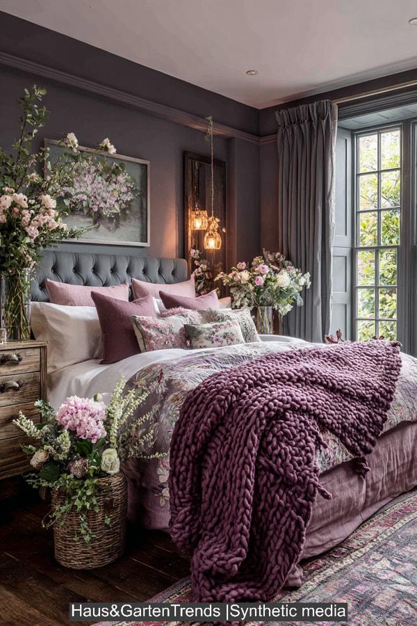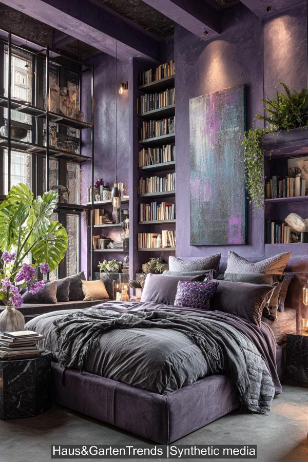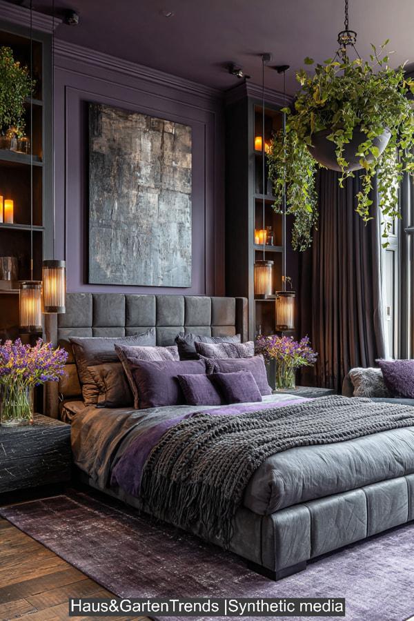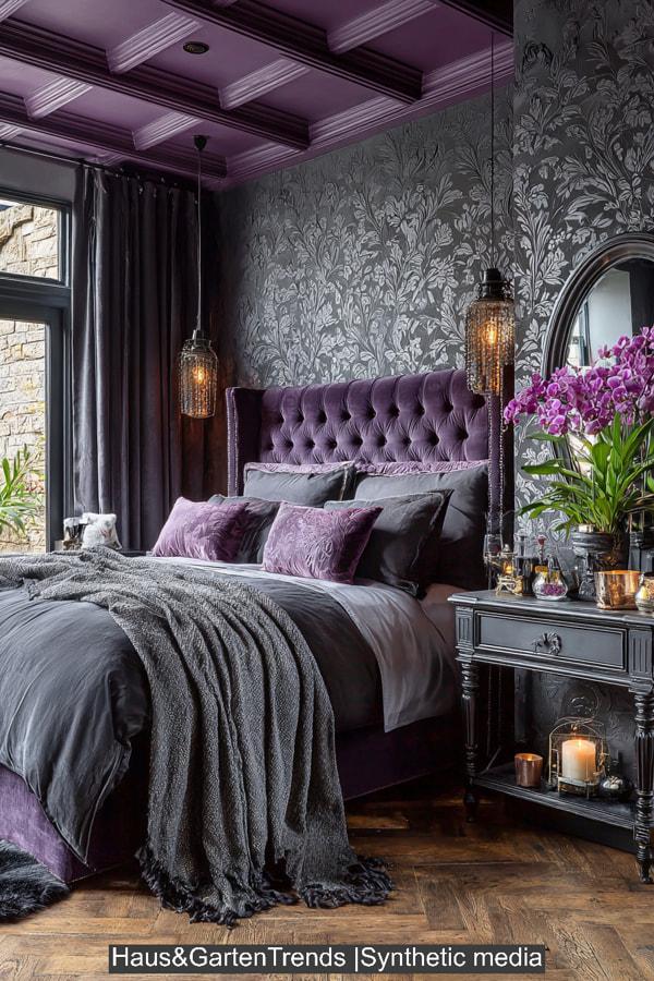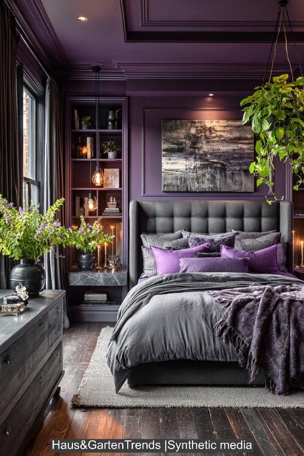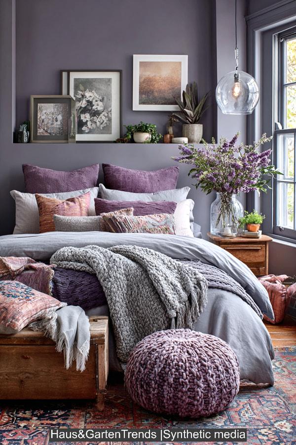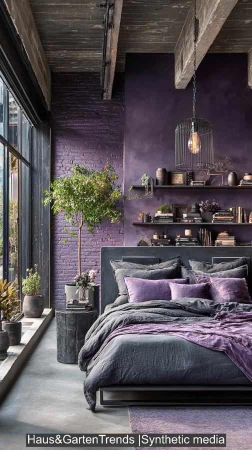 Dunkle Lilatöne wie Pflaume oder Aubergine verleihen dem Raum eine sinnliche, cocooningartige Geborgenheit, während helle Graunuancen das Gesamtbild auflockern und strukturieren. Je nach Licht verändert sich die Wirkung: tagsüber ruhig und edel, abends intensiv, fast dramatisch. Genau diese Wandelbarkeit macht den Reiz aus. Die Kombination eignet sich ideal für alle, die ein Schlafzimmer mit Tiefe und Charakter schaffen wollen – ruhig, stilvoll und mit einer subtilen, emotionalen Intensität, die lange nachwirkt.