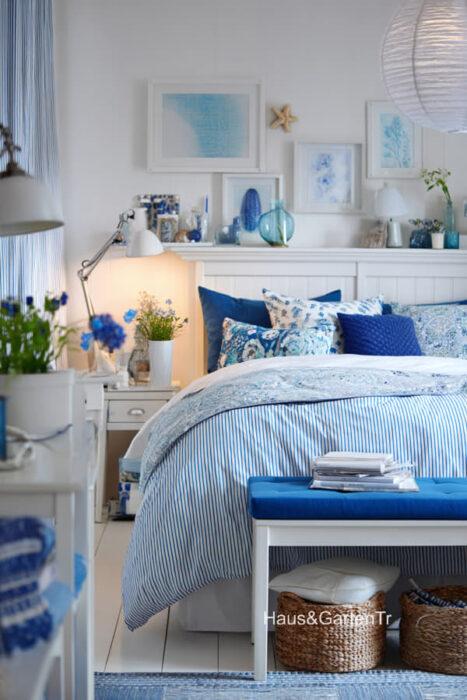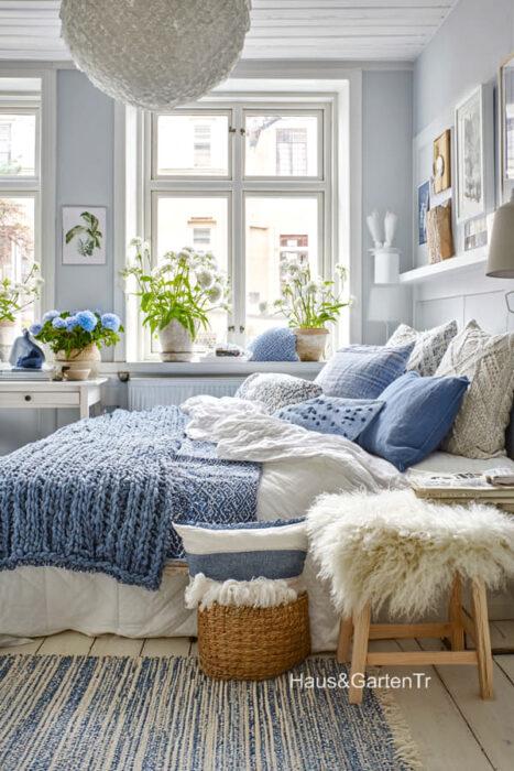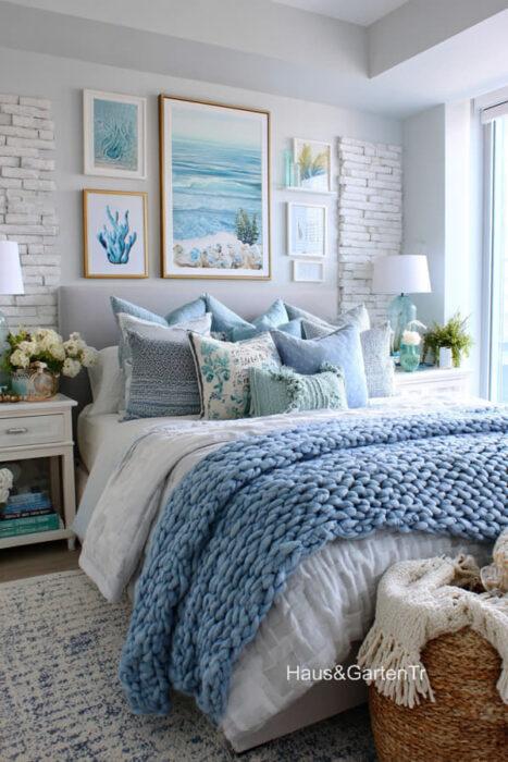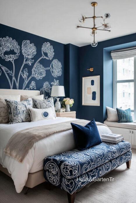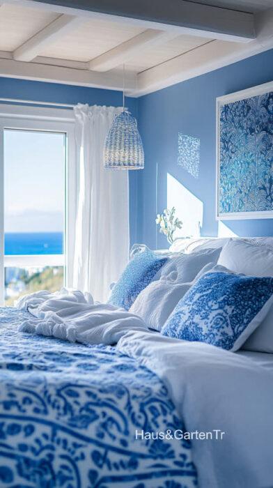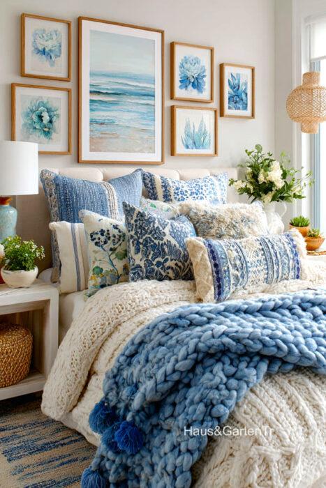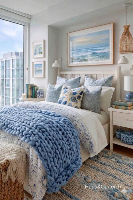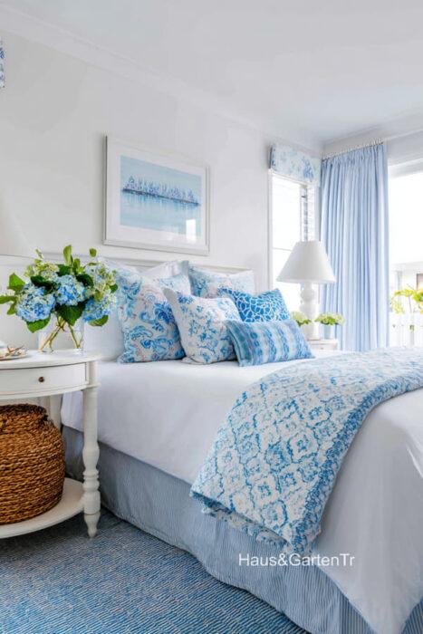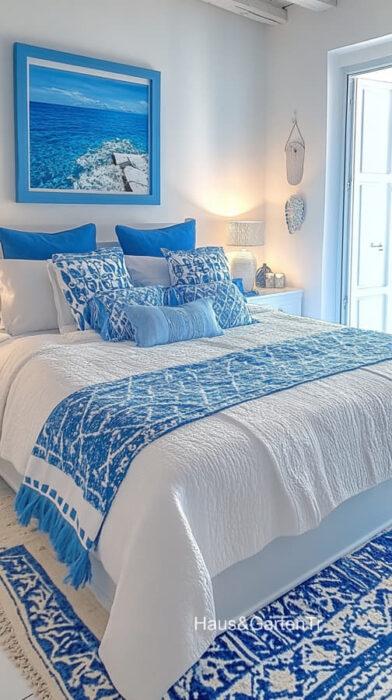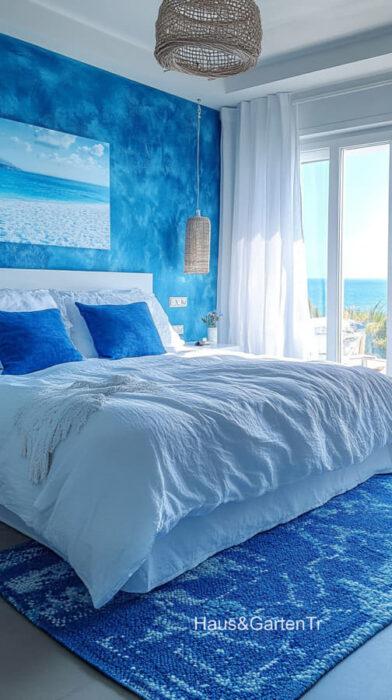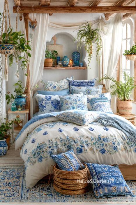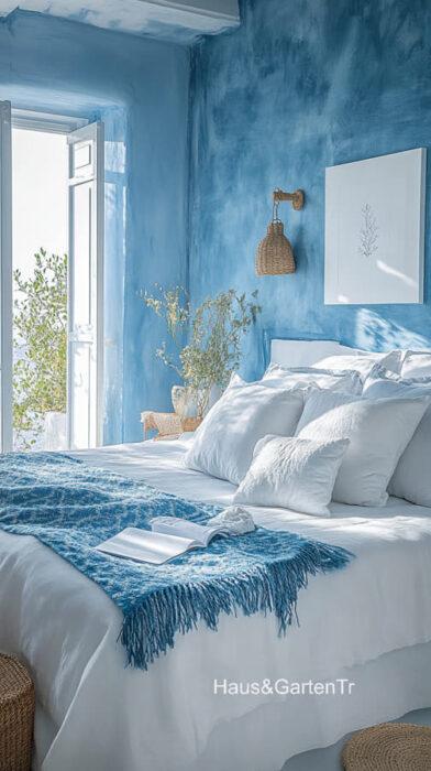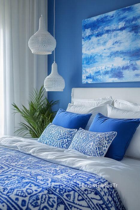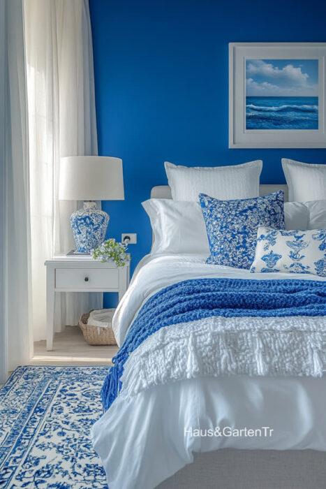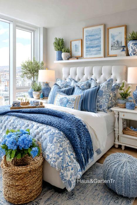 Blau und Weiß verwandeln jedes Schlafzimmer in eine ruhige Wohlfühloase. Dieser Artikel zeigt über 15 inspirierende Schlafzimmer-Ideen, die von maritimer Leichtigkeit, frischer Eleganz, Gelassenheit und zeitloser Ruhe geprägt sind. Von sanften Himmelblautönen über kräftiges Marineblau bis hin zu strahlend weißen Textilien – entdecke stilvolle Kombinationen aus Bettwäsche, Wandfarben, Dekokissen, Teppichen und Möbeln. Perfekt für alle, die ihr Schlafzimmer in einen entspannenden Rückzugsort mit Küstenflair verwandeln möchten.
