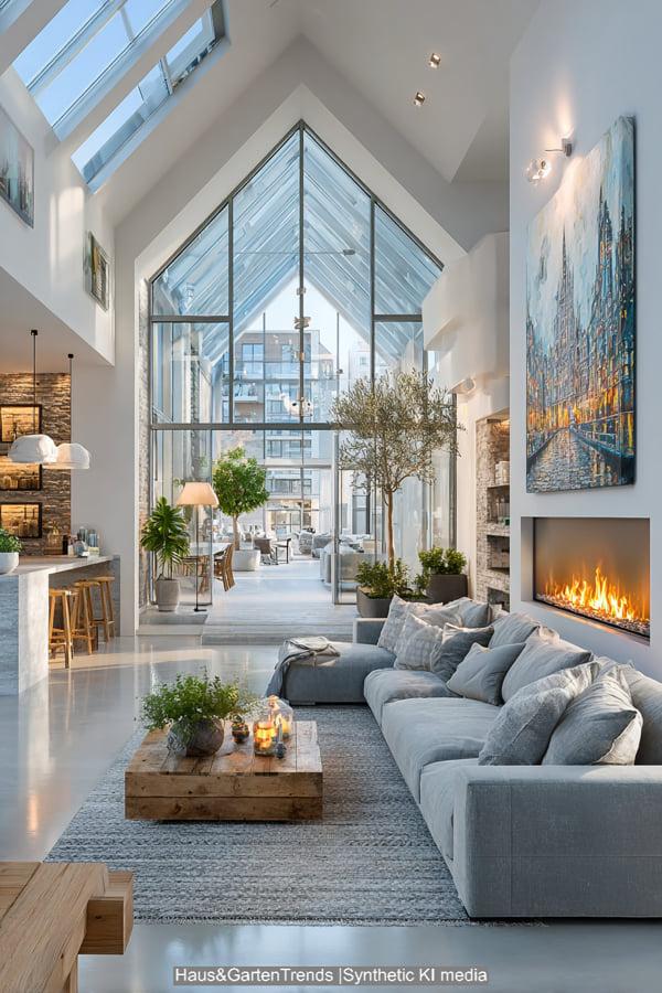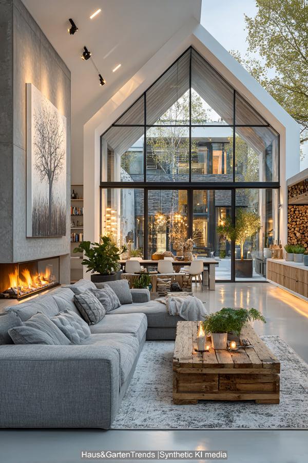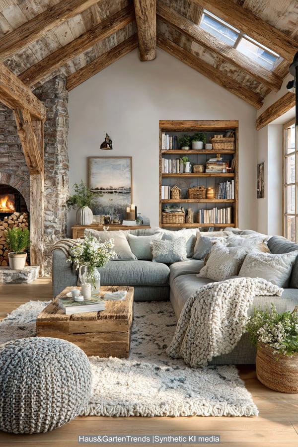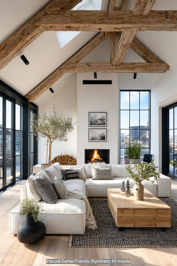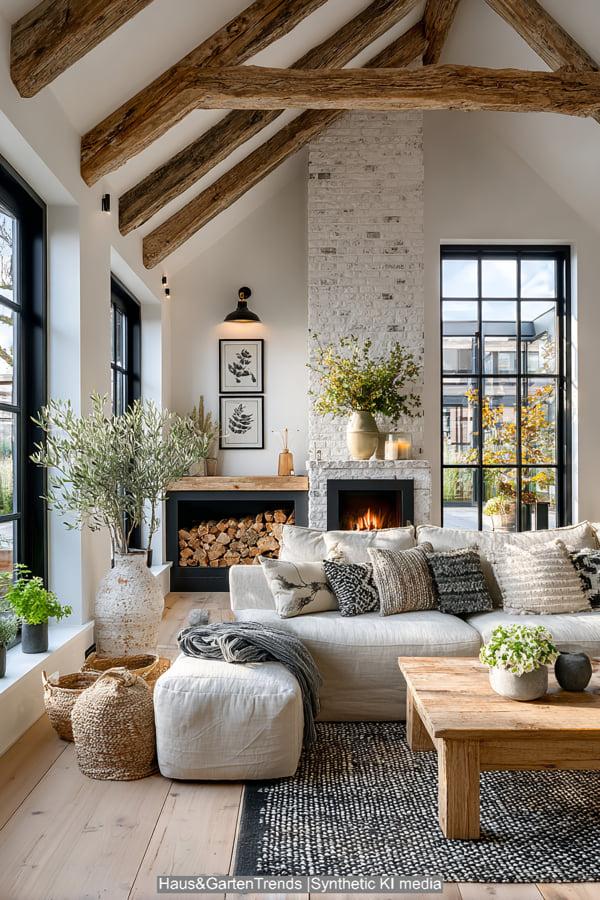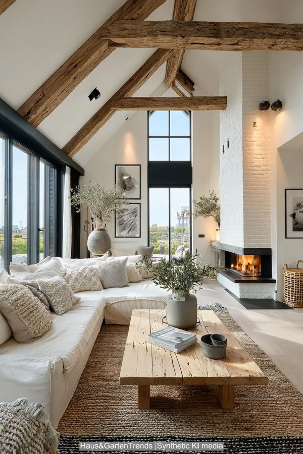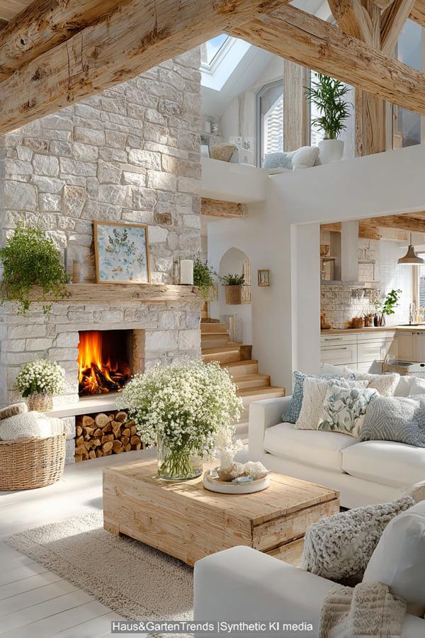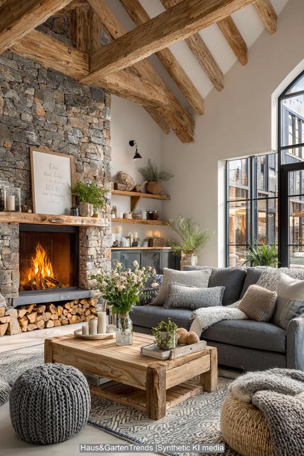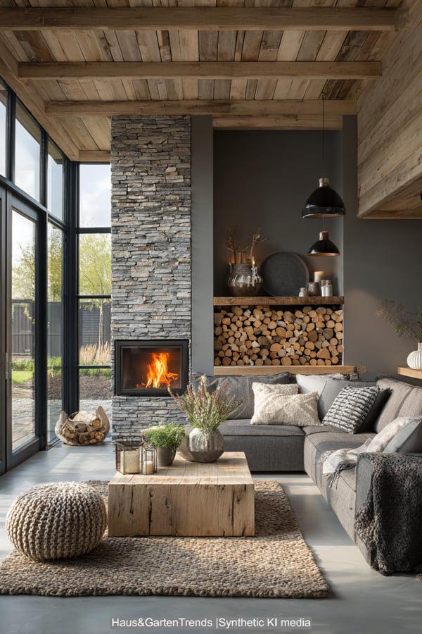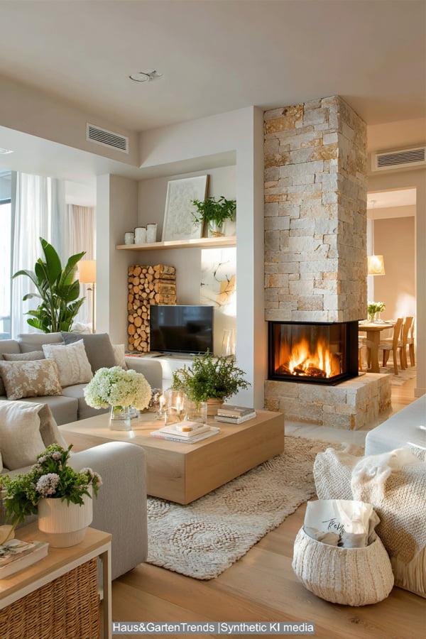 Diese Design-Idee rückt das haptische Erlebnis in den Vordergrund. Das Herzstück bildet ein raumhoher Kamin aus grob behauenem Naturstein, der dem modernen Raum eine archaische Kraft verleiht. Sanfte Erdtöne und Textilien in Off-White und Beige dominieren die Sitzlandschaft, während ein massiver, niedriger Couchtisch aus hellem Eichenholz für Erdung sorgt. Die Kombination aus einem geflochtenen Korb für Decken, frischen weißen Hortensien und einem dekorativ gestapelten Holzvorrat schafft eine Atmosphäre, die skandinavische Leichtigkeit mit rustikaler Geborgenheit vereint. Es ist ein Look, der durch indirektes Licht und natürliche Materialien eine unvergleichliche Wärme ausstrahlt und das Wohnzimmer in eine wahre Wohlfühloase verwandelt.