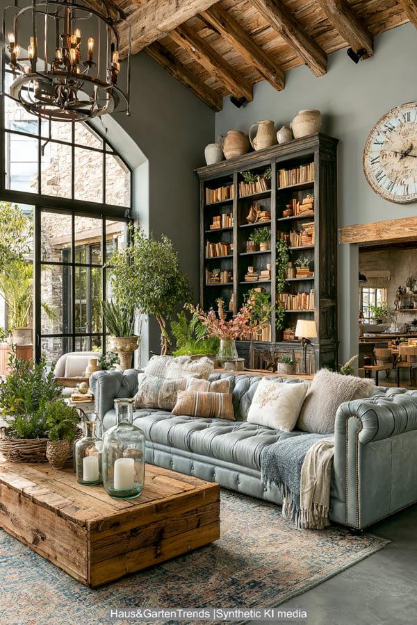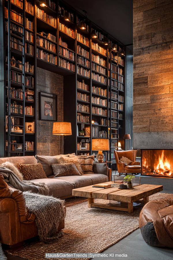 Das bibliophile Bauernhaus macht die Liebe zu Büchern zum Gestaltungselement. Eine deckenhohe Regalwand aus dunklem Holz mit einer rollenden Leiter bildet den Hintergrund. Schwere Ohrensessel aus Leder und viele kleine Lichtquellen schaffen eine Atmosphäre der Konzentration. Der Kamin ist hier essentielles Element für die Behaglichkeit. Rustikale Dielenböden und dicke Wolldecken machen das Bild perfekt. Es ist ein Raum für Genießer, die das Wohnzimmer als Ort der Ruhe und des persönlichen Rückzugs fernab der digitalen Hektik betrachten.