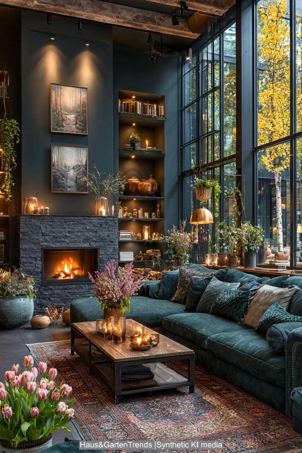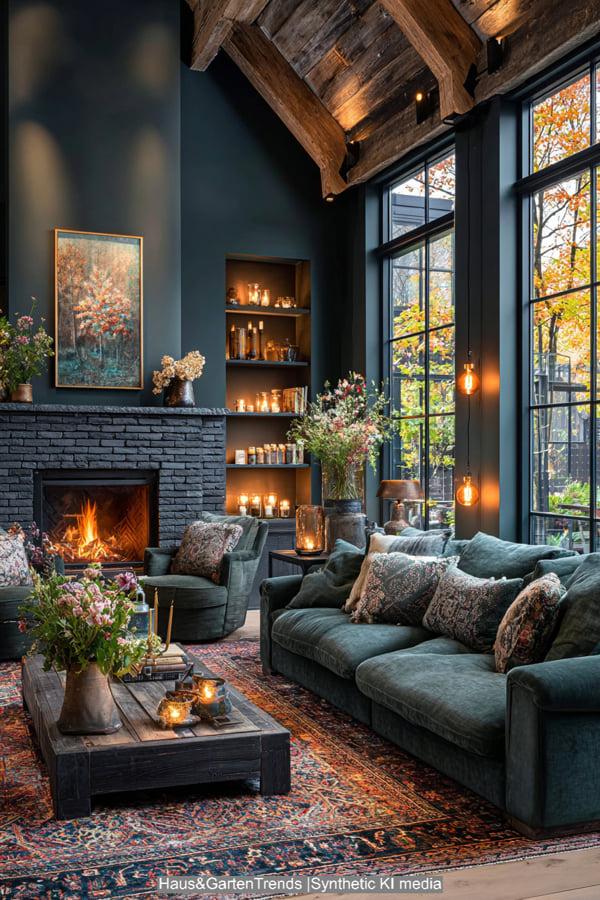 Wer sagt, dass Bauernhäuser immer weiß sein müssen? Der „Moody“-Stil nutzt dunkle Wandfarben wie Waldgrün oder Anthrazit, um eine kokonartige Sicherheit zu schaffen. In Kombination mit schweren Samtstoffen und dunklem Nussbaumholz entsteht ein luxuriöser Look. Ein flackerndes Kaminfeuer und warme Goldakzente in den Leuchten setzen die notwendigen Highlights in der Dunkelheit. Dieser Stil ist mutig und hochelegant. Er eignet sich hervorragend für Räume, die vor allem abends genutzt werden, da er eine unvergleichliche Tiefe und Intimität erzeugt.