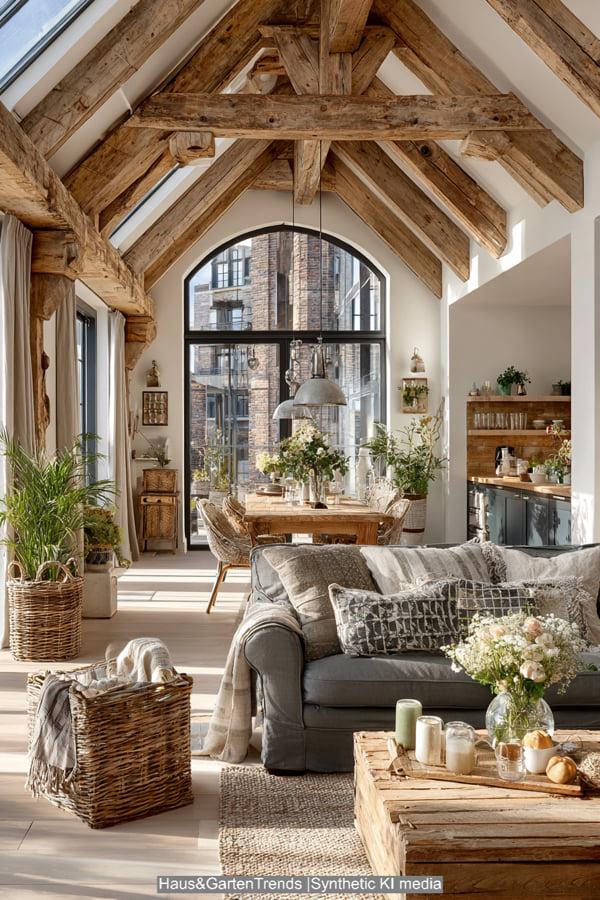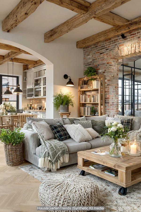 Hier verschmilzt skandinavischer Minimalismus mit dem Farmhouse-Gedanken. Die Farbwelt bleibt streng monochrom in Creme- und Sandtönen, was eine unglaubliche Ruhe ausstrahlt. Statt harter Kontraste setzen wir auf „Texture-on-Texture“: Ein Bouclé-Sofa kombiniert mit Grobstrickdecken und einem flauschigen Wollteppich. Helle Holzarten wie Esche oder Kiefer verstärken das luftige Gefühl. Dieser Stil verzichtet fast völlig auf Dekoration, außer auf organische Formen wie handgetöpferte Vasen. Es ist der perfekte Rückzugsort für Minimalisten, die eine weiche, fast meditative Atmosphäre suchen.