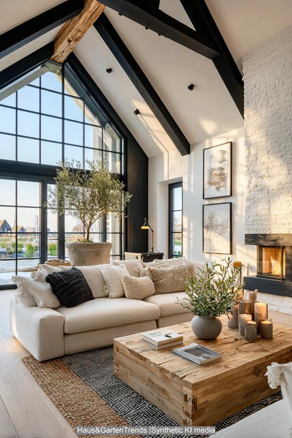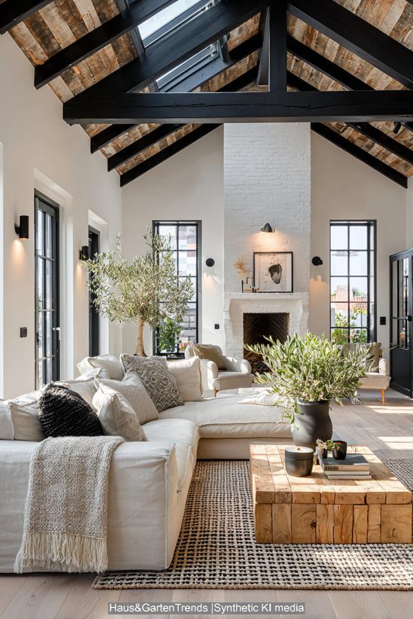 Dieser Look lebt von seiner dramatischen Schlichtheit. Weiße Wände und helle Leinenmöbel bilden die Leinwand für markante schwarze Akzente. Ob es die schwarz lackierten Fensterrahmen, die gusseisernen Leuchten oder die dunkel gebeizten Deckenbalken sind – der Kontrast verleiht dem Raum Struktur. Ein massiver Couchtisch aus Eiche und ein strukturierter Jute-Teppich sorgen dafür, dass die kühle Farbkombination nicht steril wirkt. Dieser Stil ist ideal für alle, die Ordnung lieben, aber auf die Wärme von Naturholz nicht verzichten möchten. Er wirkt zeitlos, maskulin und einladend hell.