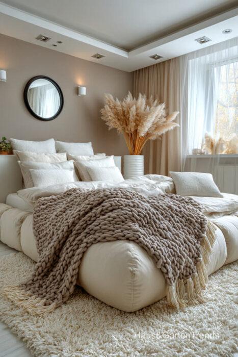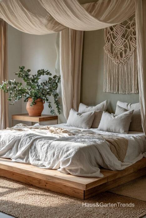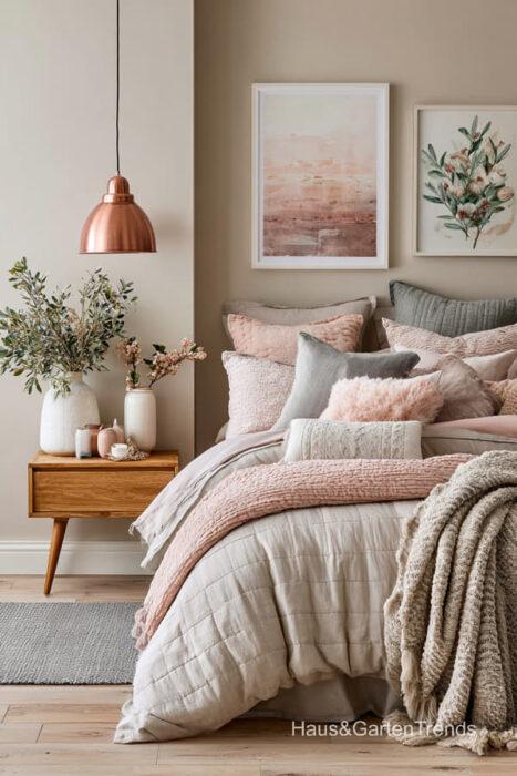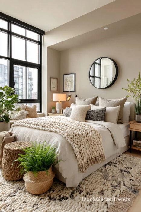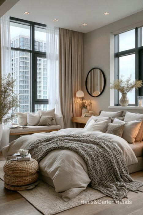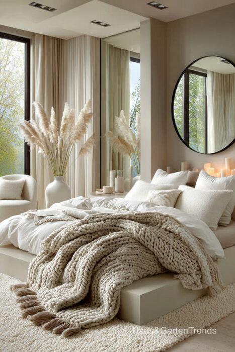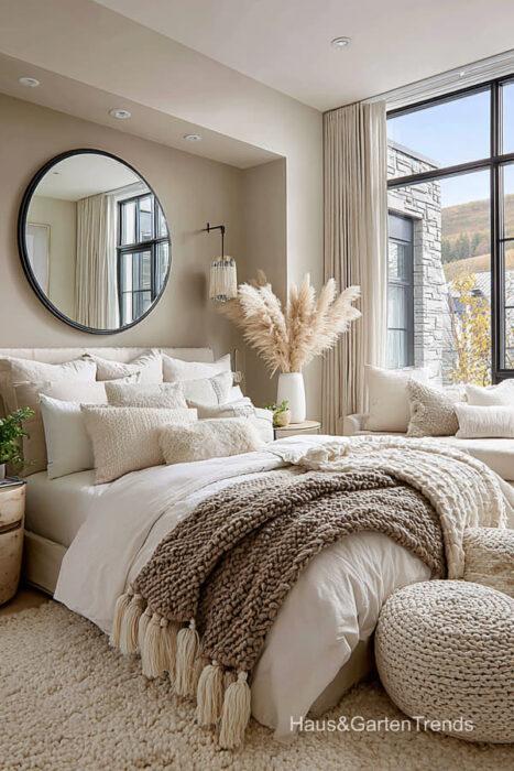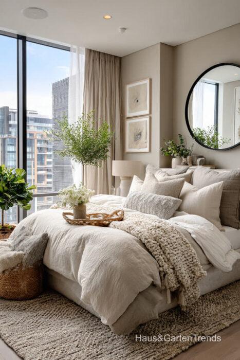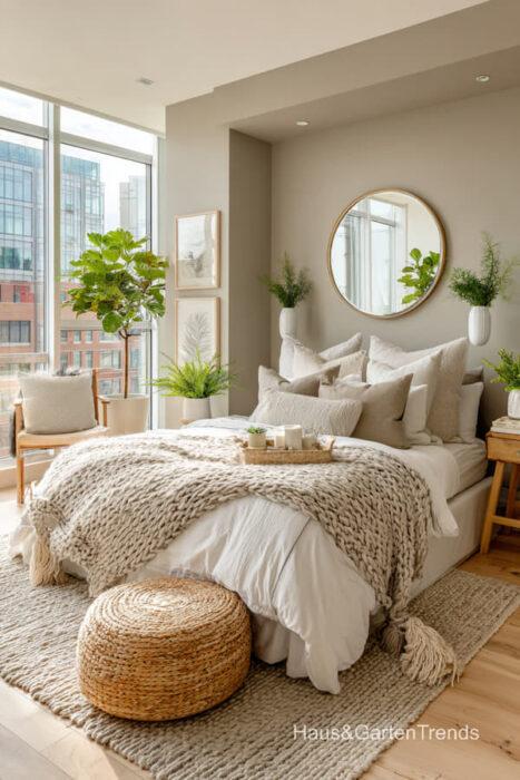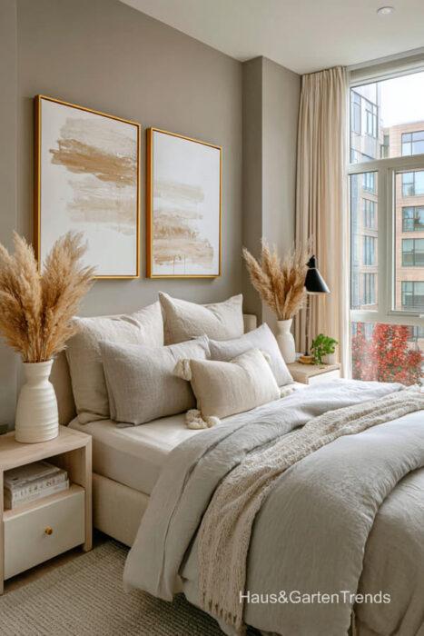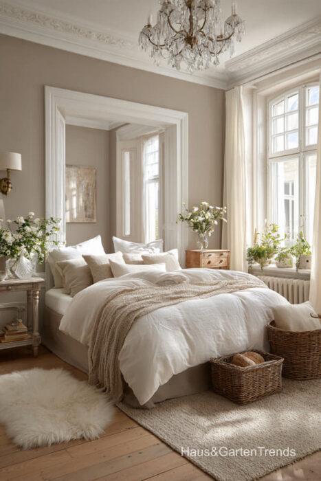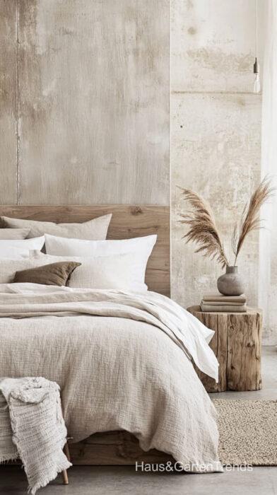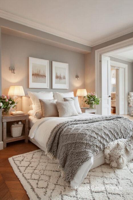 Wände in zartem Greige bilden eine beruhigende Basis, während natürliche Materialien wie Holz, Leinen oder Bouclé dem Raum Tiefe und Charakter verleihen. Ein gepolstertes Bett in Greige-Nuancen wirkt sanft, einladend und luxuriös, besonders in Kombination mit strukturierter Bettwäsche, Layering aus Decken und tonalen Kissen.