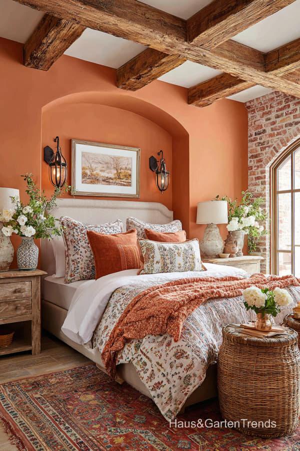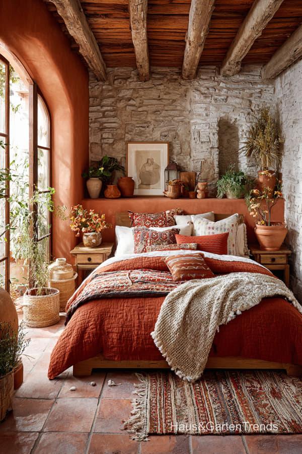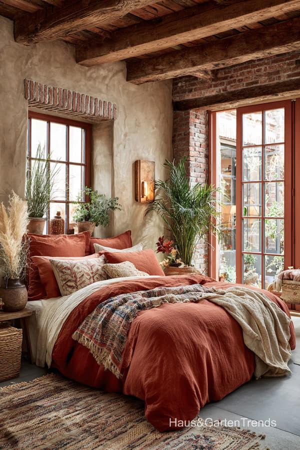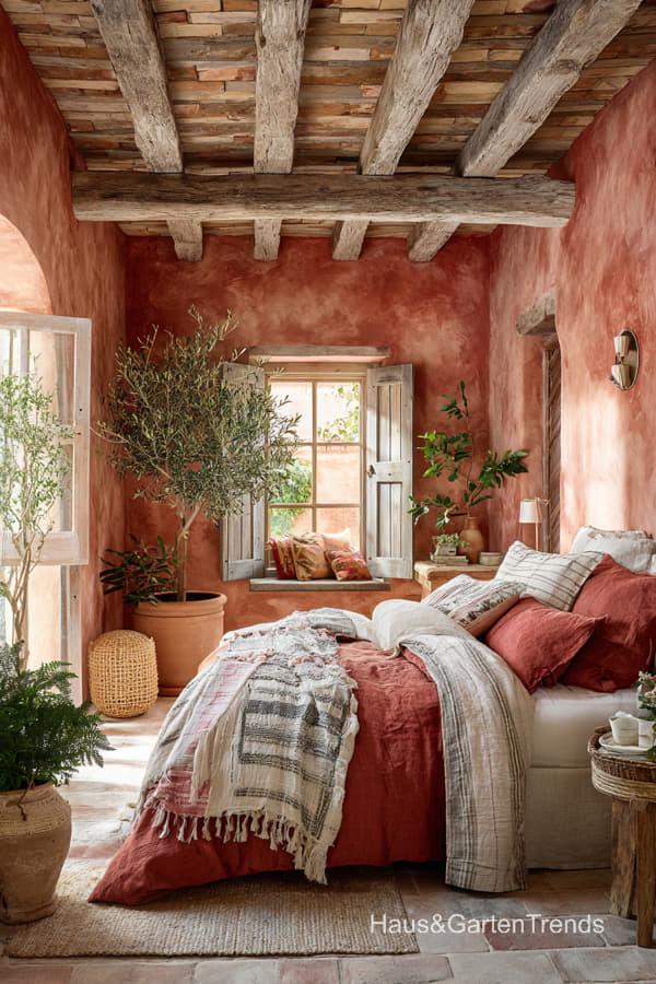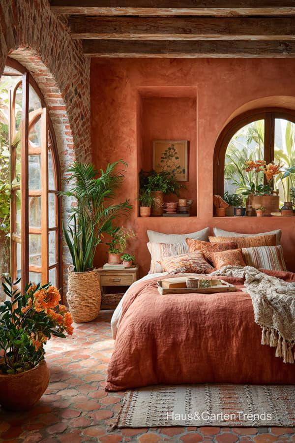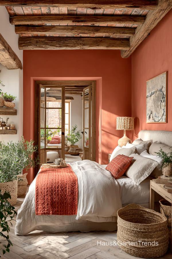 Entdecke 30+ inspirierende Schlafzimmer Ideen in Terracotta, die mediterrane Wärme, Geborgenheit und echtes Urlaubsflair ausstrahlen. Die erdige, sinnliche Wirkung dieser warmen Farbe – angesiedelt zwischen Rot, Orange und Braun und inspiriert von gebrannter Erde – schafft eine beruhigende, ausgleichende Atmosphäre, ideal für Rückzug und Entspannung. Ob modern-minimalistisch, boho, mediterran-elegant oder luxuriös und tiefgründig: Terracotta passt sich mühelos verschiedensten Einrichtungsstilen an und verleiht jedem Schlafzimmer Charakter und Tiefe.