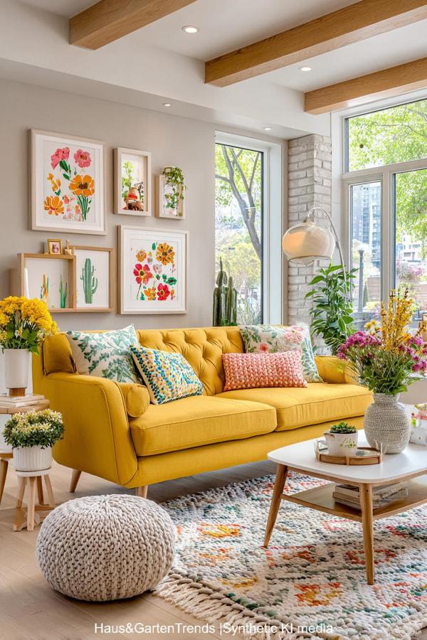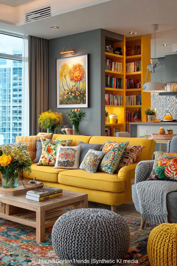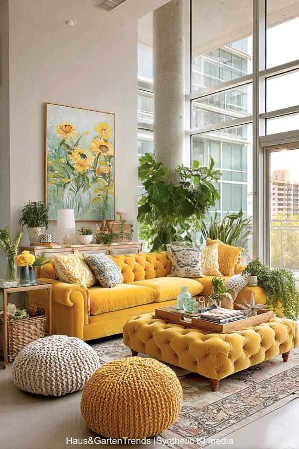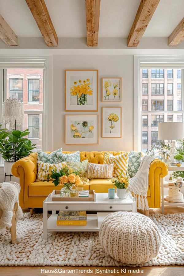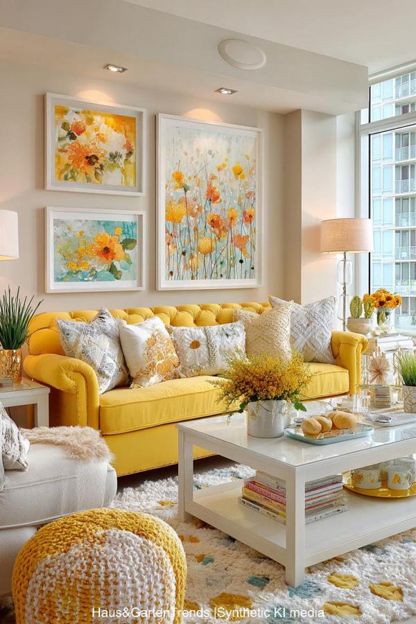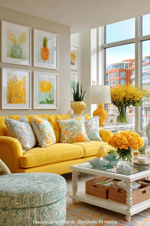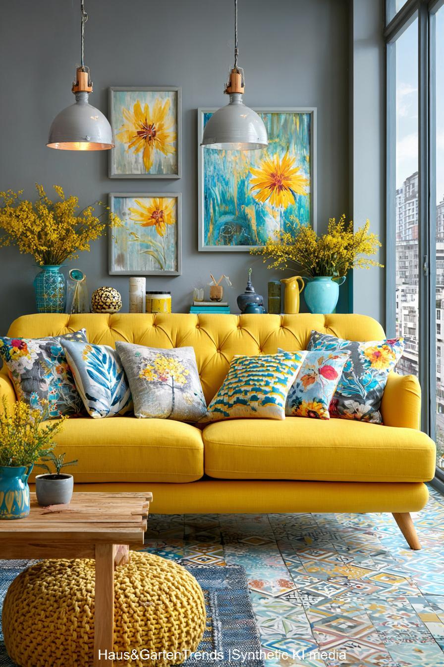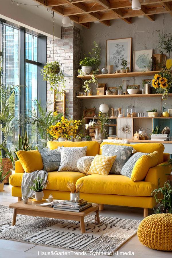 Machen Sie Ihr gelbes Sofa mit verspielten, skurrilen Designs zum Star der Show. Wählen Sie warme Gelbtöne und leuchtende Orangetöne für einen fröhlichen Look, der die Gäste sofort zum Lächeln bringt. Wählen Sie Möbelstücke aus natürlichen Materialien wie Holz oder Bambus, um die Szene zu vervollständigen und eine einladende Atmosphäre zu schaffen. Sie können auch Kunstwerke im Afrika-Stil oder Kissen in kräftigen ethnischen Mustern hinzufügen, um den Raum noch fröhlicher zu gestalten