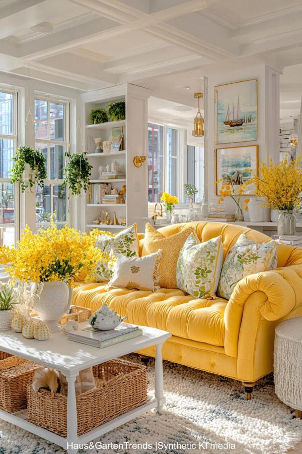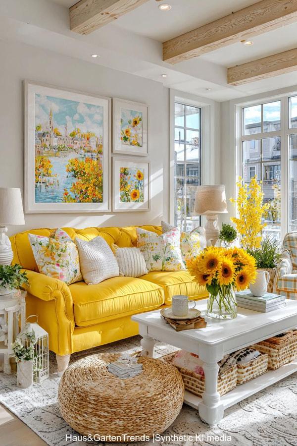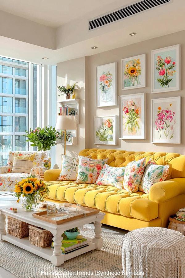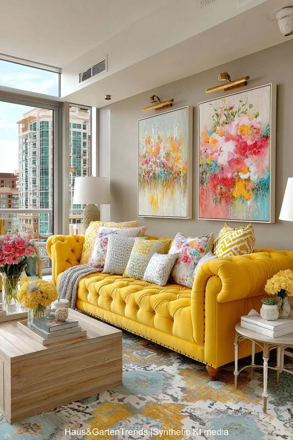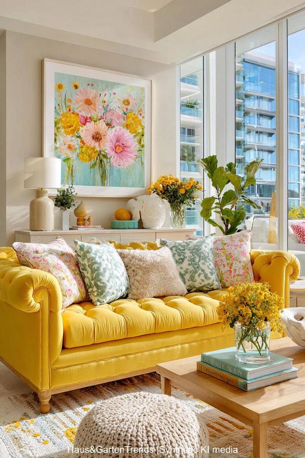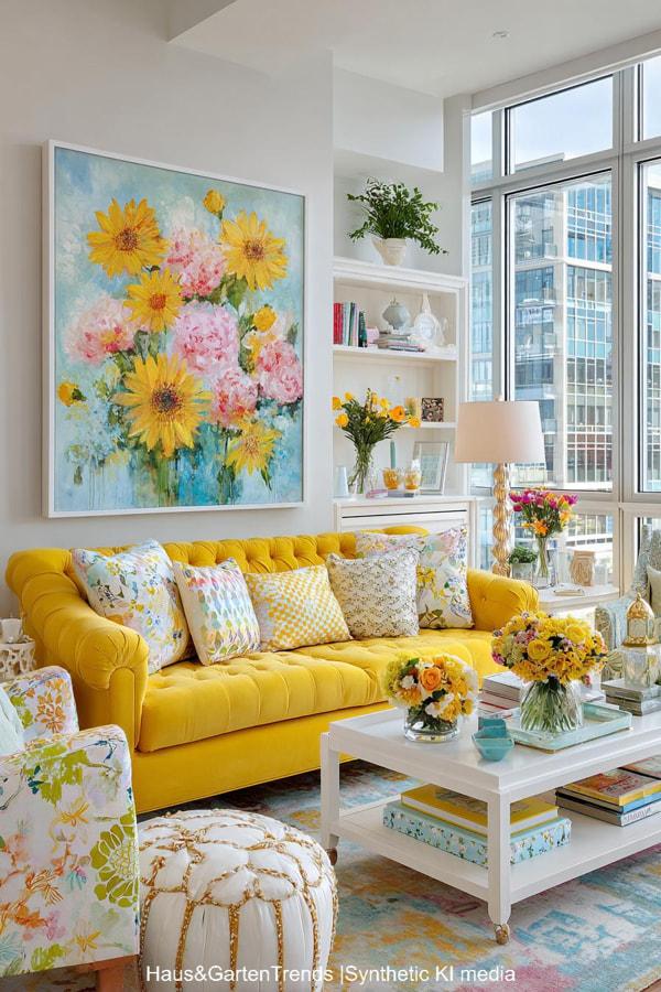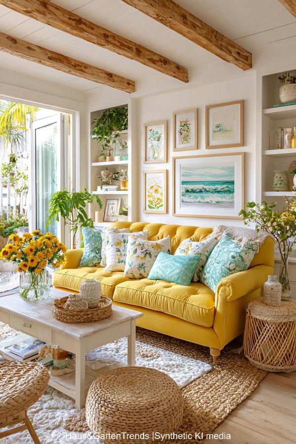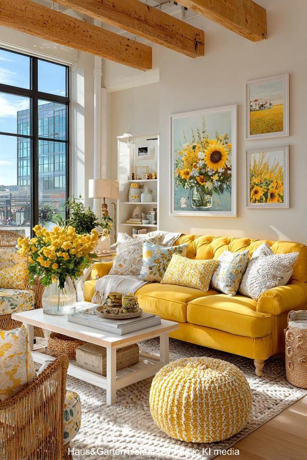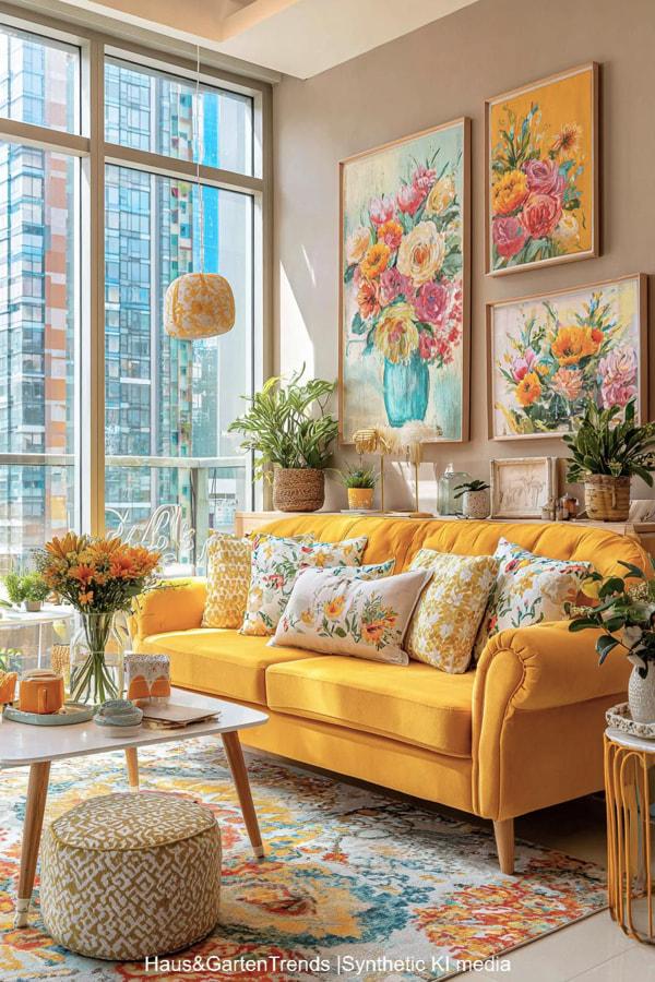Machen Sie Ihr gelbes Sofa mit verspielten, skurrilen Designs zum Star der Show. Wählen Sie warme Gelbtöne und leuchtende Orangetöne für einen fröhlichen Look, der die Gäste sofort zum Lächeln bringt. Wählen Sie Möbelstücke aus natürlichen Materialien wie Holz oder Bambus, um die Szene zu vervollständigen und eine einladende Atmosphäre zu schaffen. Sie können auch Kunstwerke im Afrika-Stil oder Kissen in kräftigen ethnischen Mustern hinzufügen, um den Raum noch fröhlicher zu gestalten