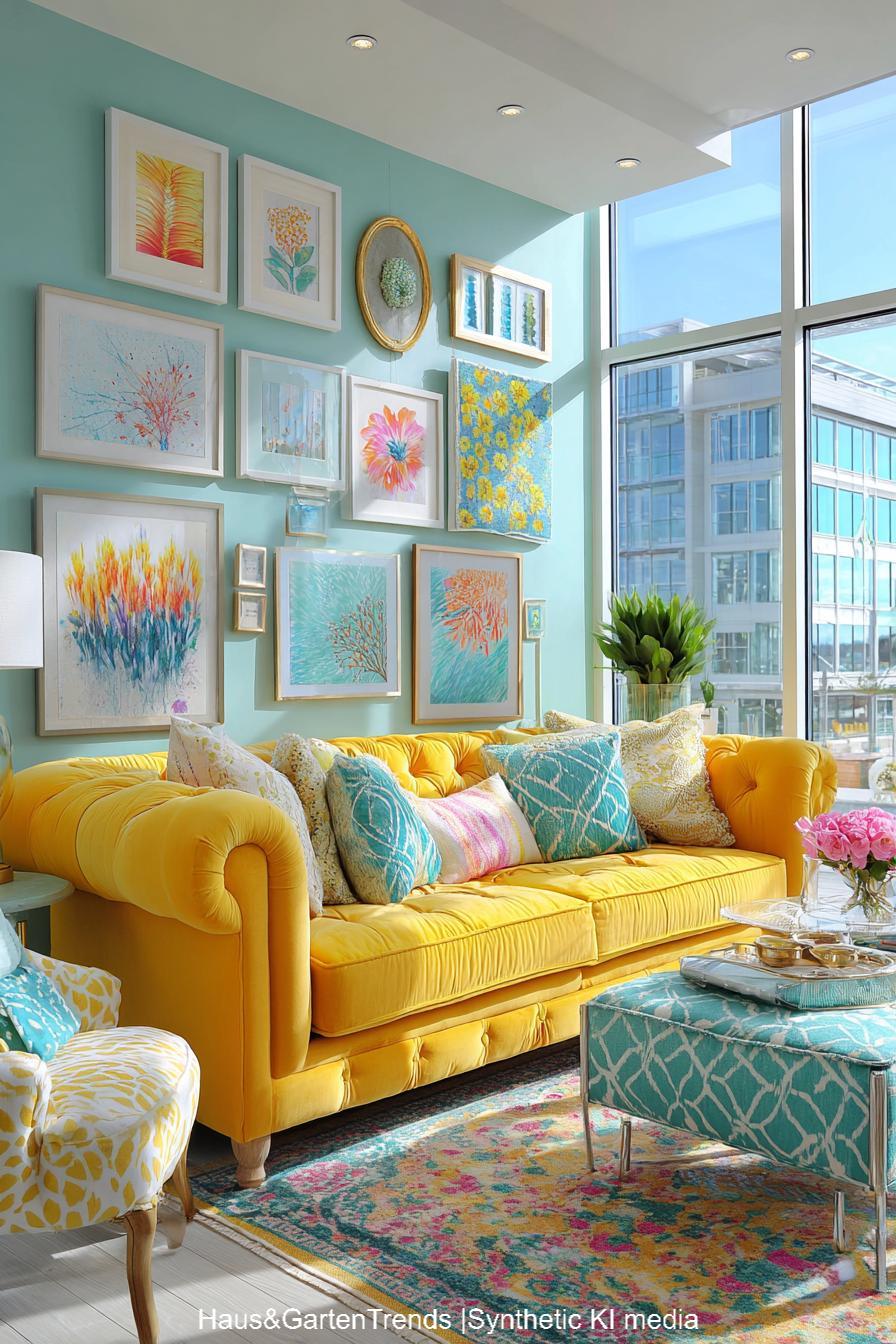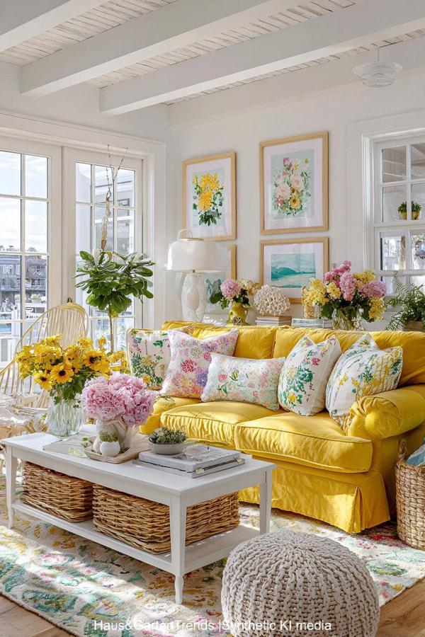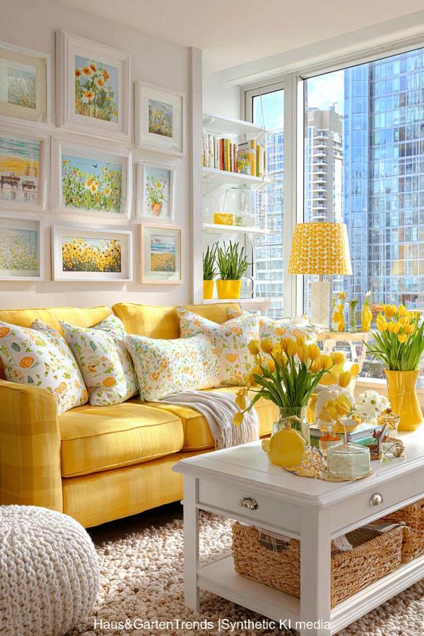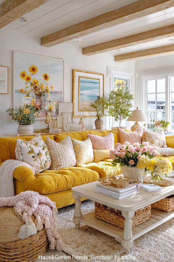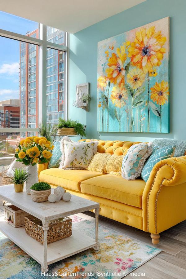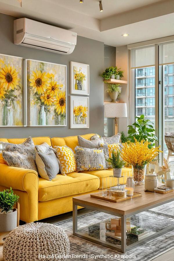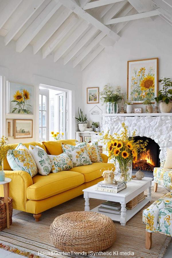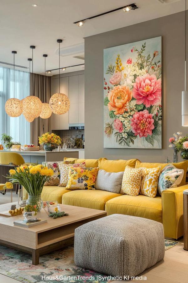 Machen Sie Ihr gelbes Sofa mit verspielten, skurrilen Designs zum Star der Show. Wählen Sie warme Gelbtöne und leuchtende Orangetöne für einen fröhlichen Look, der die Gäste sofort zum Lächeln bringt. Wählen Sie Möbelstücke aus natürlichen Materialien wie Holz oder Bambus, um die Szene zu vervollständigen und eine einladende Atmosphäre zu schaffen. Sie können auch Kunstwerke im Afrika-Stil oder Kissen in kräftigen ethnischen Mustern hinzufügen, um den Raum noch fröhlicher zu gestalten