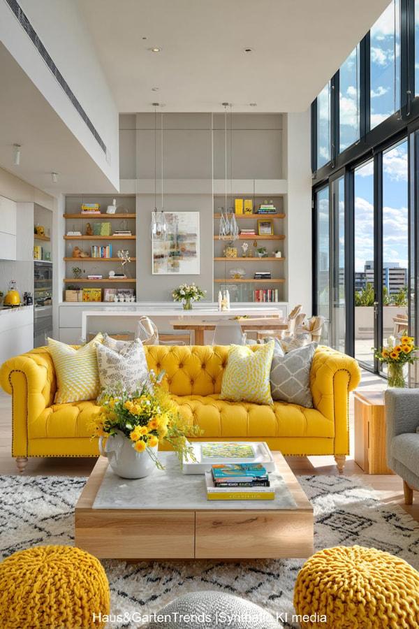 Ein fröhliches gelbes Sofa steht vor einer großen Fensterfront im Wohnzimmer und schafft eine helle, warme Atmosphäre. Der Farbton des Sofas strahlt eine aufmunternde Energie aus, die die Gäste erfrischt und verjüngt, wenn sie den Raum betreten. Ein sanfter Gelbton eignet sich besonders gut für Räume mit neutralen oder kühleren Farbtönen, da er gerade genug Helligkeit hinzufügt, um einen fröhlichen und einladenden Raum zu schaffen.