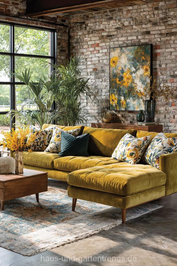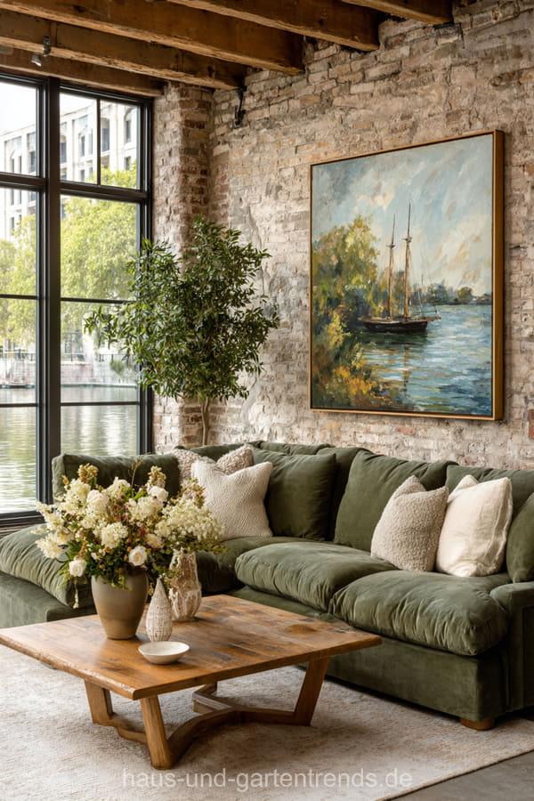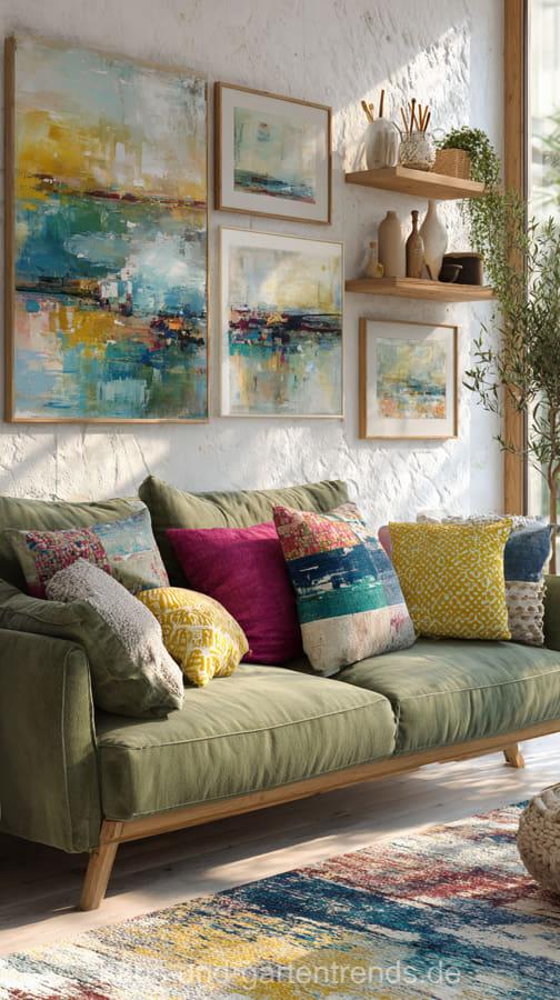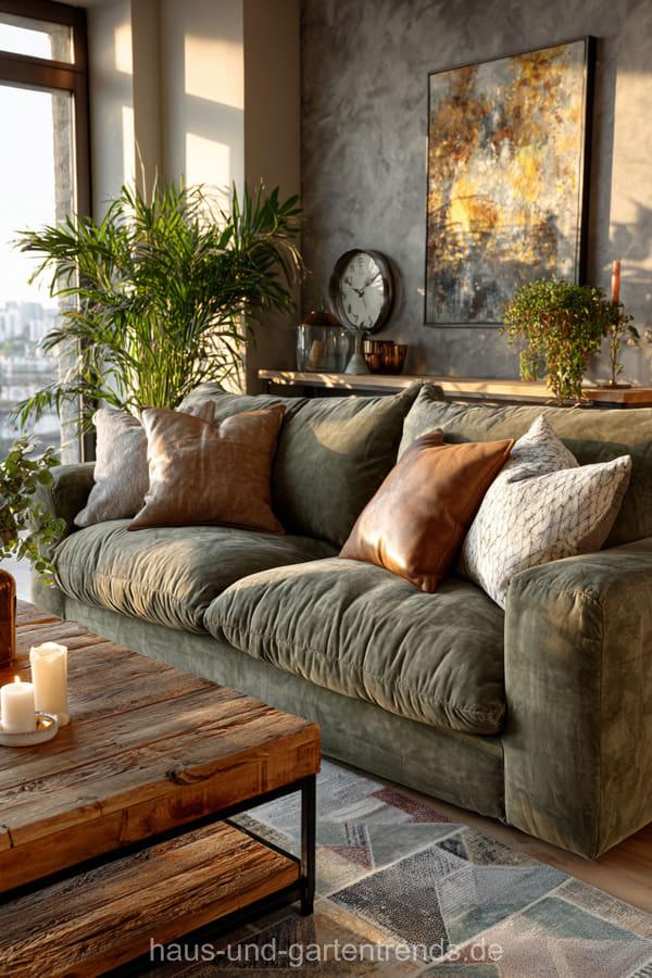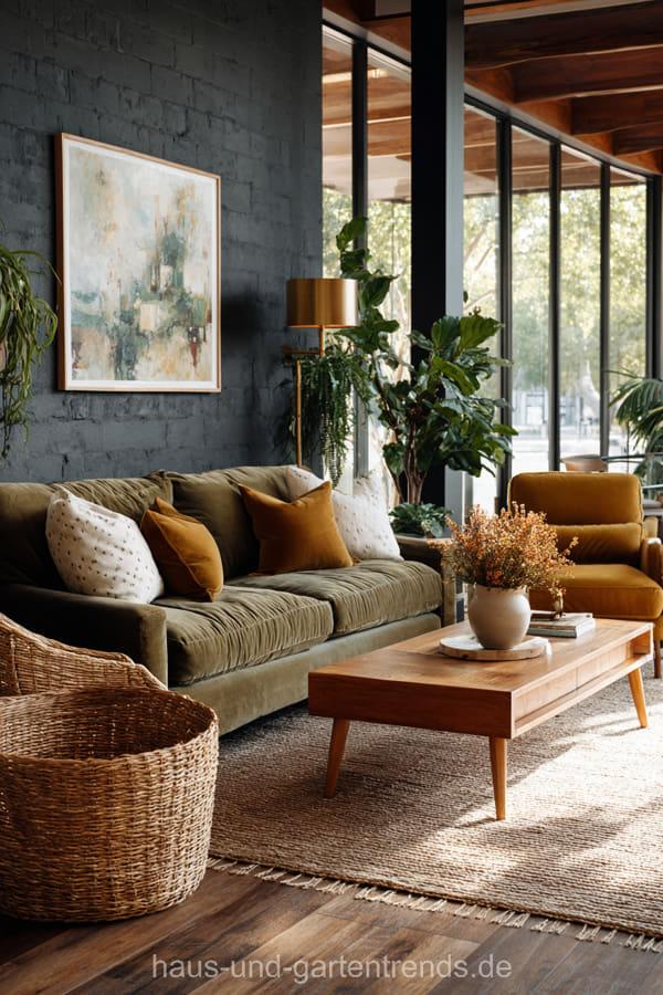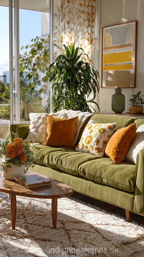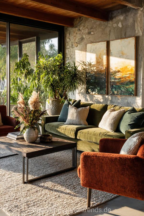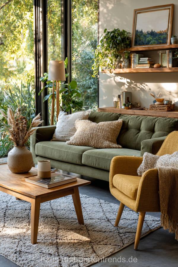 Olivgrün ist eine perfekte Ergänzung zu anderen Erdtönen wie Braun, Orange oder Gelb. Diese Kombination erzeugt ein warmes und gemütliches Ambiente, das ideal für das Wohnzimmer ist.