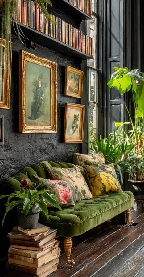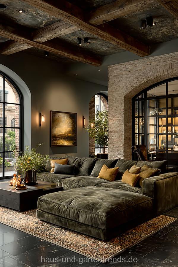 Dunkle Farben wie Schwarz, Dunkelblau oder Dunkelbraun können verwendet werden, um das Olivgrün des Sofas hervorzuheben und einen dramatischen Look zu erzielen, z.B. eine schwarze Wand.
