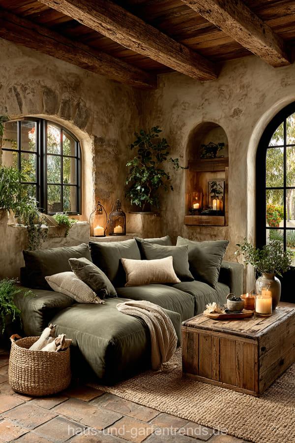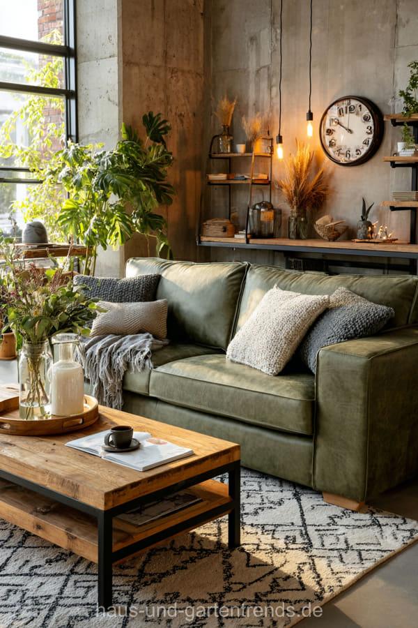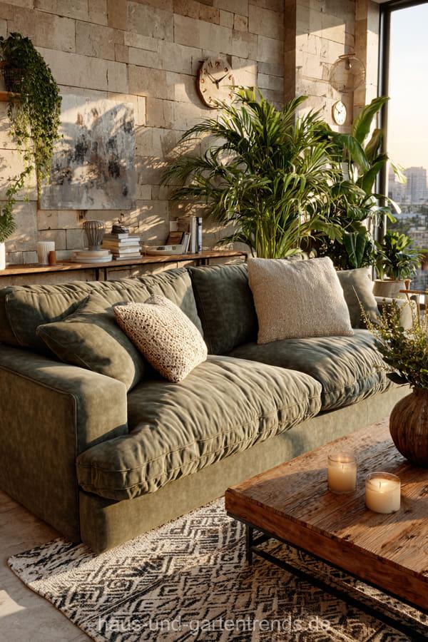 Olivgrün harmoniert perfekt mit Naturmaterialien wie Holz, Stein oder Rattan. Diese Kombination schafft einen ruhigen und entspannenden Look, der ideal für das Wohnzimmer ist.