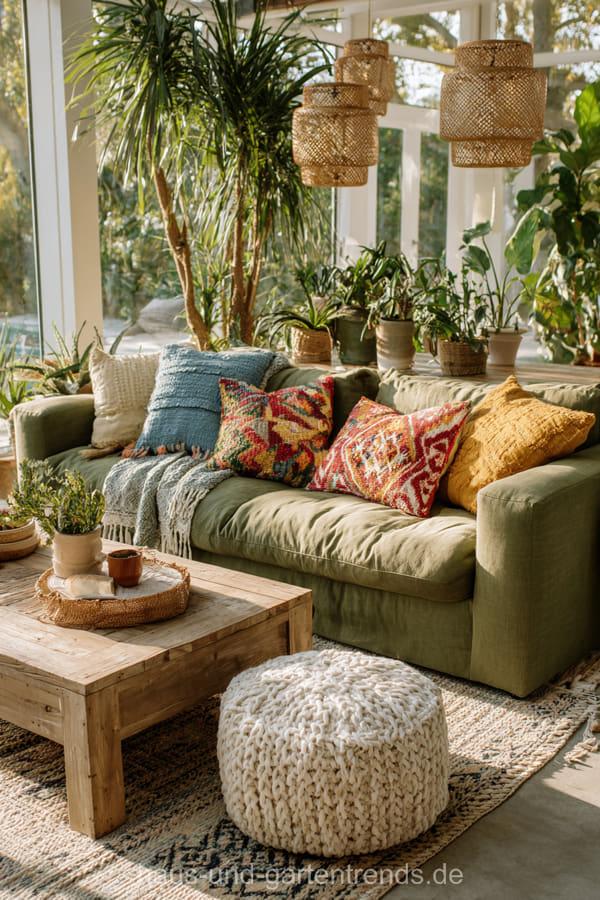 Mit seinen beruhigenden, erdigen Tönen ist Olivgrün die perfekte Wahl für Räume mit unkonventioneller oder vielseitiger Atmosphäre und wird oft mit dem Bohème-Stil der Inneneinrichtung in Verbindung gebracht. Ein olivgrünes Sofa kann dazu beitragen, einen Boho-Wohnzimmer mit bunten ethnischen Mustern harmonisch und natürlich wirken zu lassen. Sein neutraler und doch lebendiger Farbton wird die anderen Elemente des Raums verankern, während sein sanfter Charakter den unbeschwerten Geist des Boho-Stils subtil widerspiegeln wird.
