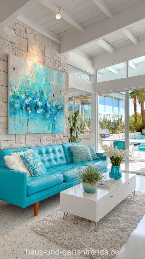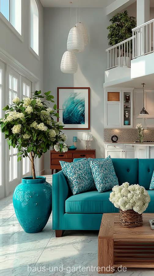 Ob türkise Sofas, Akzentwände, Kissen, Teppiche oder Deko-Highlights: Die Farbe lässt sich vielseitig kombinieren – besonders harmonisch mit Weiß, Beige, Sandtönen, Naturholz, Rattan und Leinen. So entsteht ein Wohnzimmer, das gleichzeitig entspannt, elegant und zeitlos wirkt.