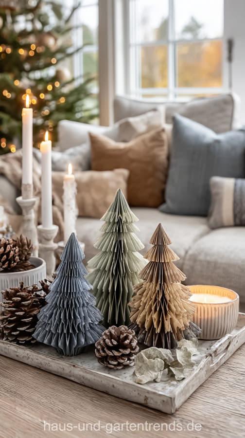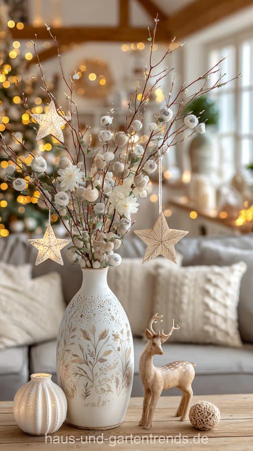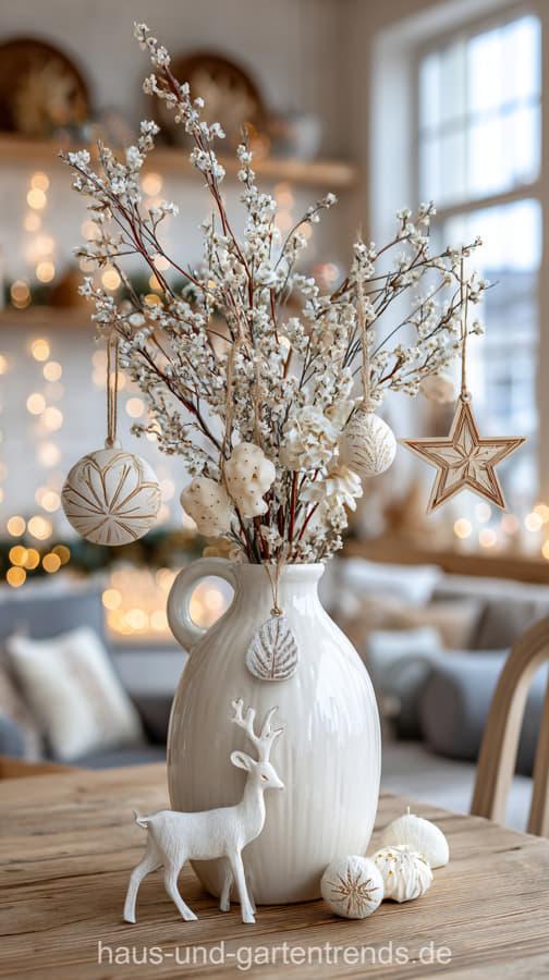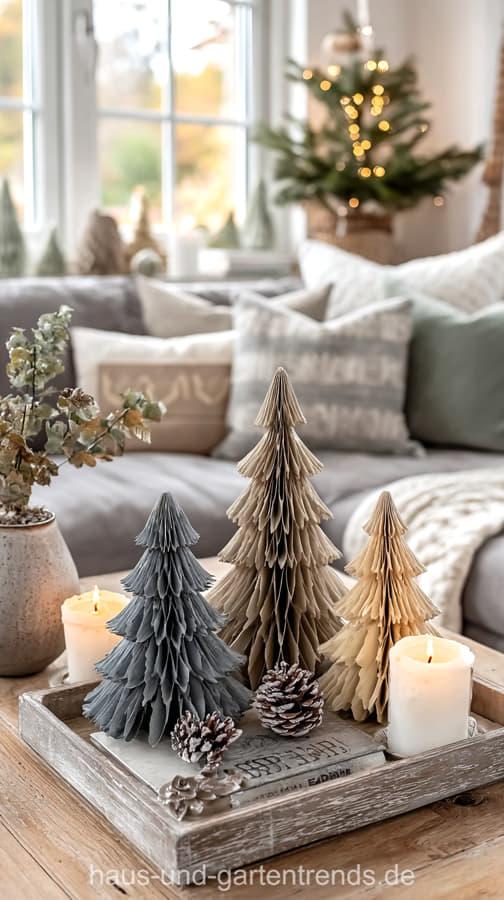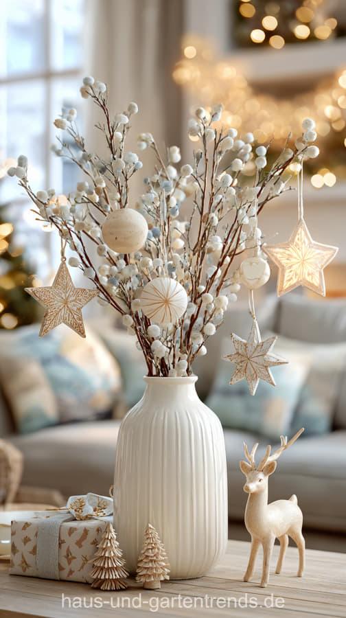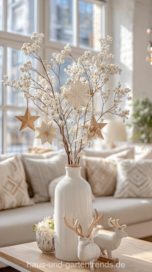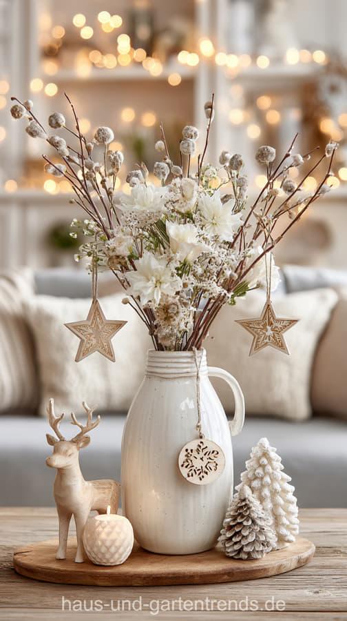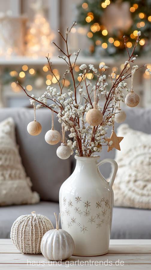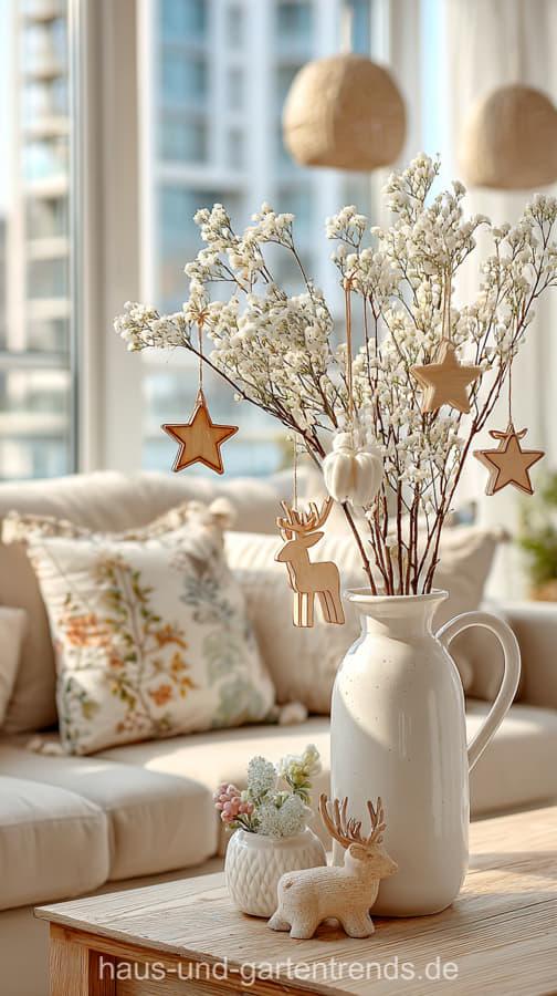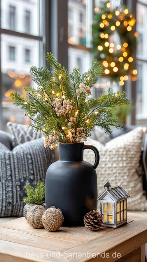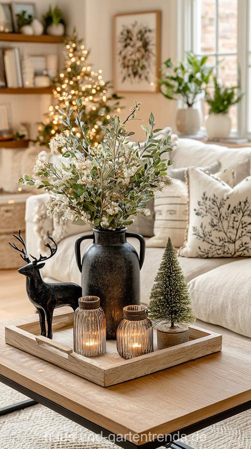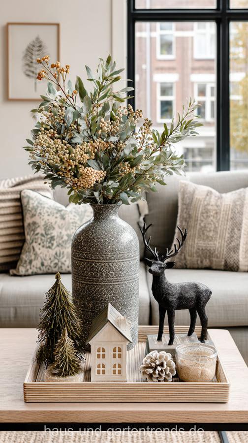Mach’s dir hyggelig! Gestalte deinen Couchtisch mit natürlichen Materialien wie Holz, Eukalyptus, Tannengrün und schlichten Kerzen – für ein stilvolles, ruhiges Winterambiente. Dieser Look ist perfekt, wenn du den skandinavischen Stil liebst und dein Wohnzimmer modern und gemütlich zugleich gestalten willst.