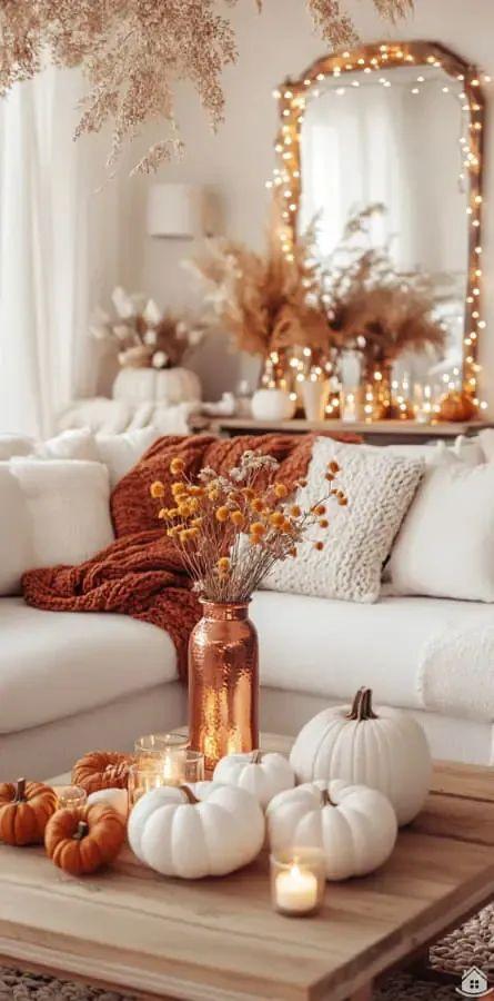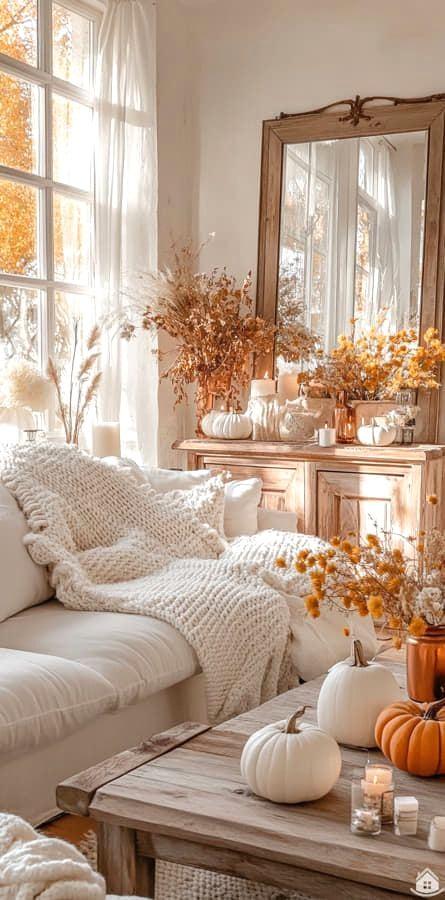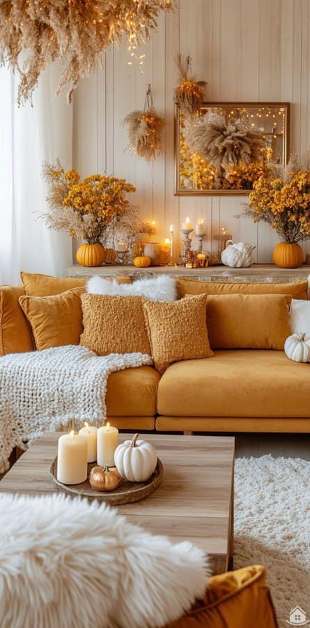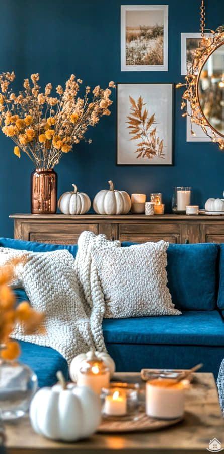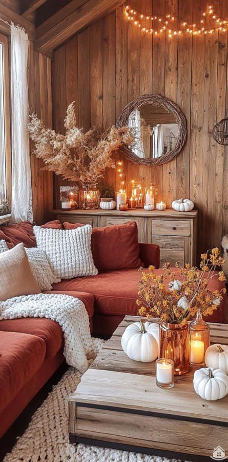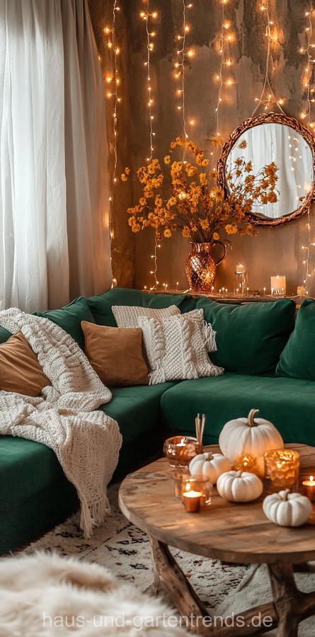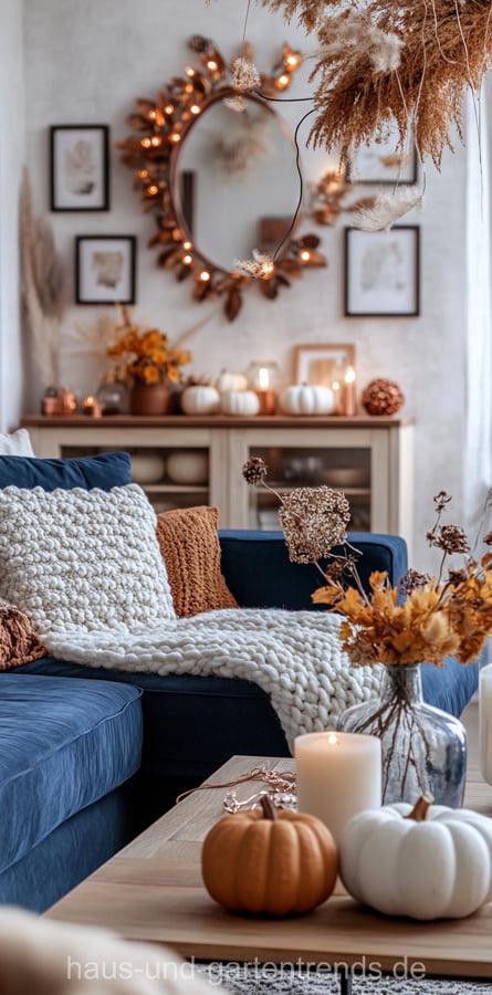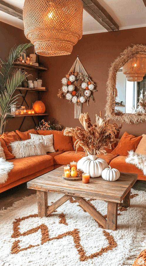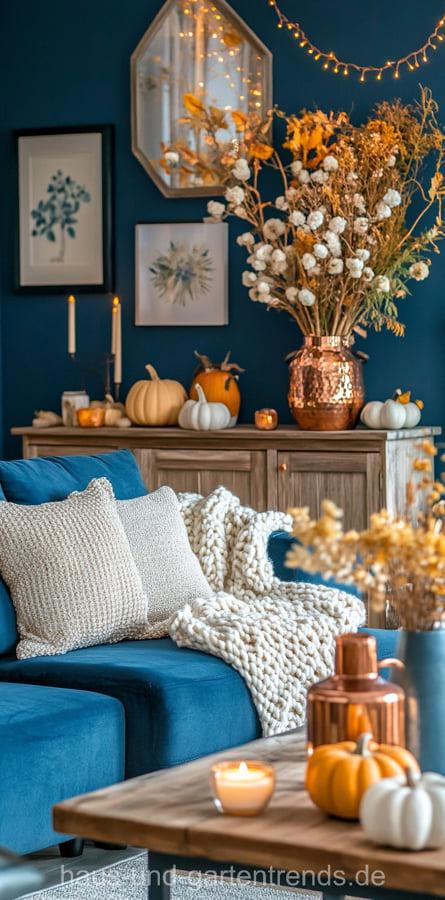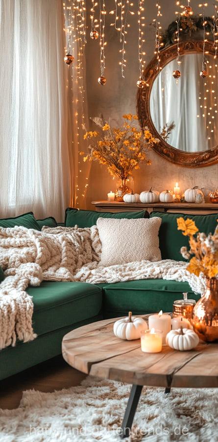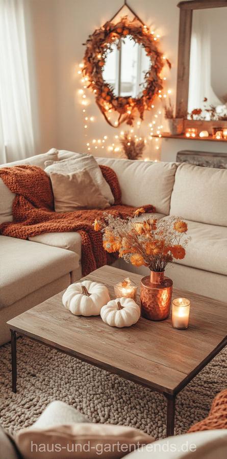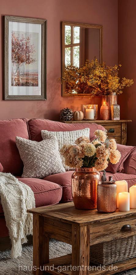 Tauche ein in die warme Atmosphäre dieser herbstlich inspirierten Wohnzimmer-Ideen: edle Erdtöne, sanftes Ocker, tiefes Rostrot und Akzente in Kupfer schaffen ein harmonisches Farbspiel. Kuschelige Strickdecken, flauschige Kissen und sanftes Kerzenlicht sorgen für pures Wohlgefühl. Diese Deko- und Farbideen verwandeln dein Zuhause in eine gemütliche Herbst-Oase – perfekt zum Entspannen an kühlen Tagen. (Hinweis: Die gezeigten Bilder wurden mit KI erstellt. Bitte achte bei echten Kerzen auf ausreichend Abstand zu brennbaren Materialien, lasse sie nie unbeaufsichtigt oder verwende alternativ LED-Kerzen bzw. Kerzen im Glas.)
